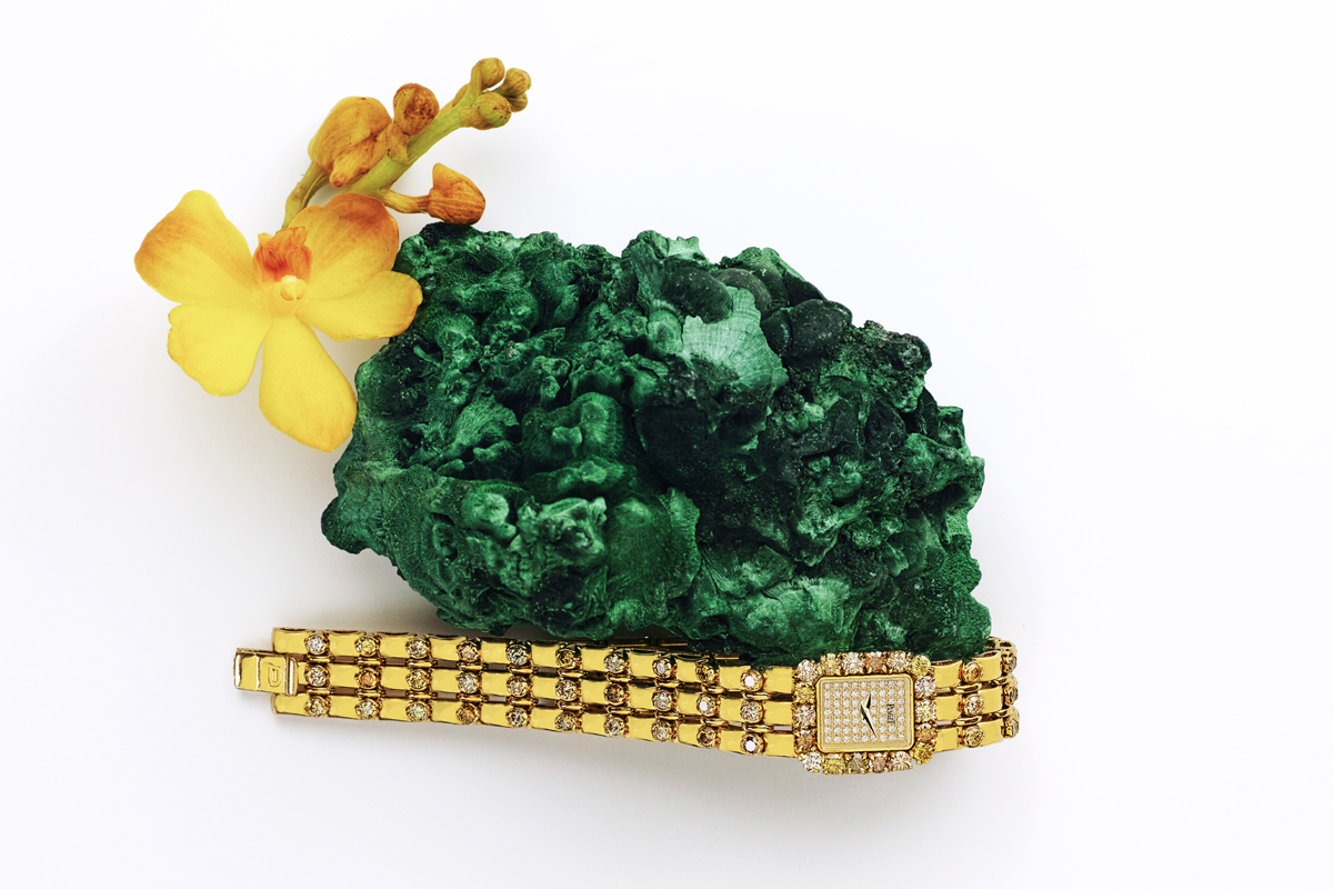 Tra gli orologi destinati a finire sotto il martelletto a Le Temps est Féminin, spiccano alcuni pezzi celebri, che in passato sono serviti a illustrare le patinate monografie sulla Maison: come l’esemplare “alla schiava” con il quadrante racchiuso in una sorta di gabbia in oro bianco full pavé, animato da un altrettanto famoso calibro ultra-piatto 9P. Ma anche modelli finora mai visti, rimasti coperti dal segreto di una committenza privata e perciò ancora più esclusivi. Per esempio quello con la cassa rettangolare, ornata sulla lunetta da diamanti colorati ad alta caratura, che ritornano in file di tre anche sul bracciale rastremato.