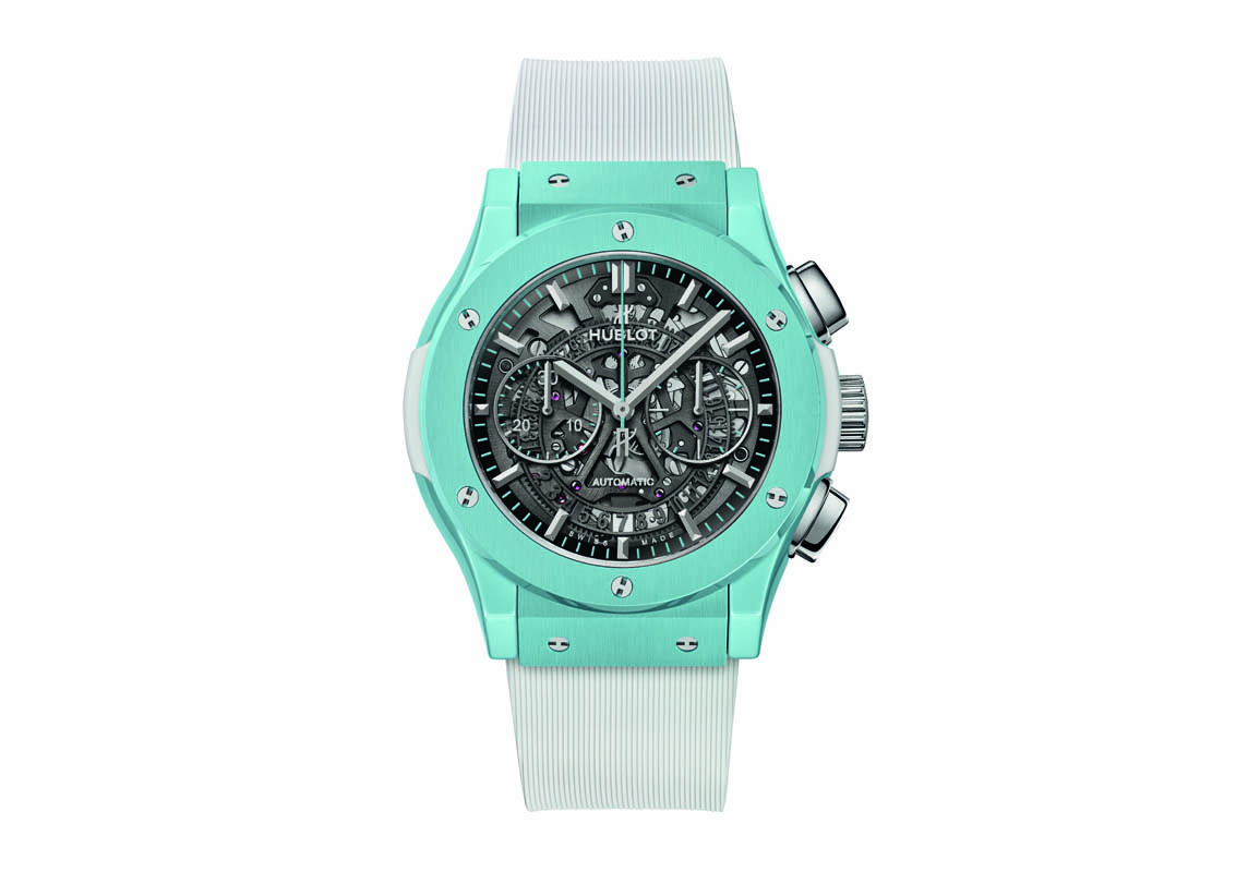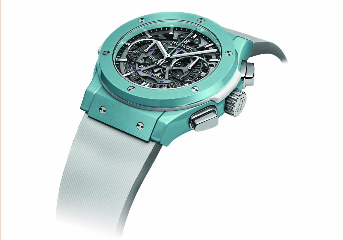 Il che potrà sembrare banale, ma non lo è. Specie quando si ha a che fare con la ceramica. E cioè con un materiale scorbutico da cuocere alla giusta temperatura e alla corretta pressione. Due parametri che spesso sballano i colori dei pigmenti usati per darle un tono. Hublot ammaestra la ceramica ormai già da tempo. E, per questa occasione, è riuscito a produrla in un bel turchese (lucido e satinato) che vuole ricordare le acque antistanti l’isola. Un modello dal carattere marino insomma, nonostante un’impermeabilità fissata a sole 5 atmosfere, limitata anche in virtù dell’essere cronografo. Ricoloscibile anche per via del movimento parzialmente messo a nudo e con componenti anneriti, visibile sullo sfondo del quadrante in vetro zaffiro.