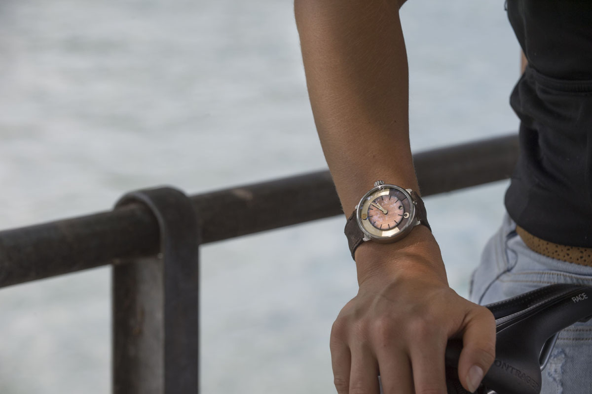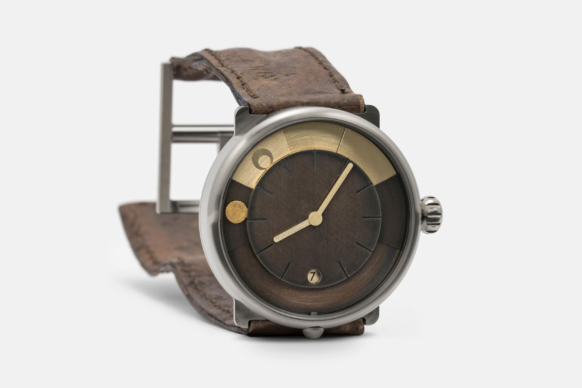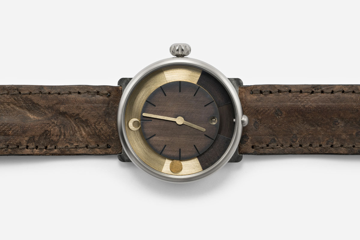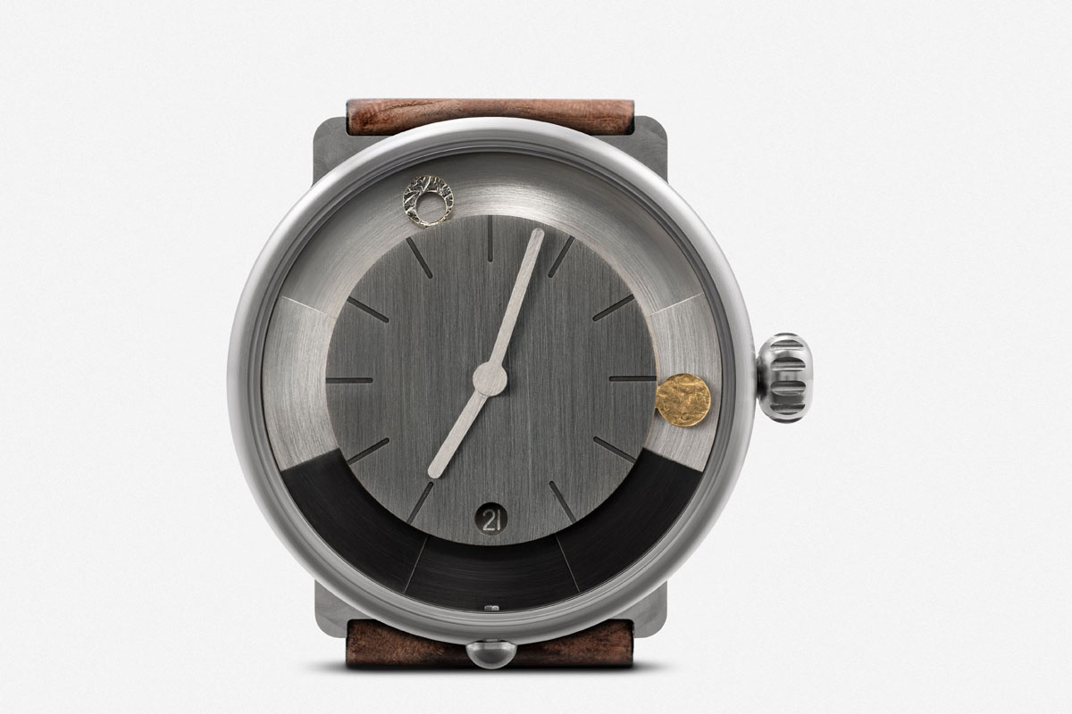Anche l’orologio di ochs und junior day/night risponde a questa logica. Con una funzionalità molto intuitiva, indica infatti – oltre alle ore, ai minuti e alla data – la durata del giorno e della notte relativa a una località prescelta, il mezzogiorno solare, l’ora dell’alba e del tramonto, la reale posizione del sole e della luna nel cielo, le fasi lunari con un errore di un giorno ogni 172,5 anni. Tutto questo solo con 13 componenti, che vanno a integrarsi al calibro di manifattura UN-320 prodotto da Ulysse Nardin (con cui Oeschlin continua a collaborare). A carica automatica, con autonomia di 50 ore, spirale e scappamento in silicio, il movimento è stato regolato a mano dai tecnici di ochs und junior con uno scarto di 0/+5 secondi al giorno.