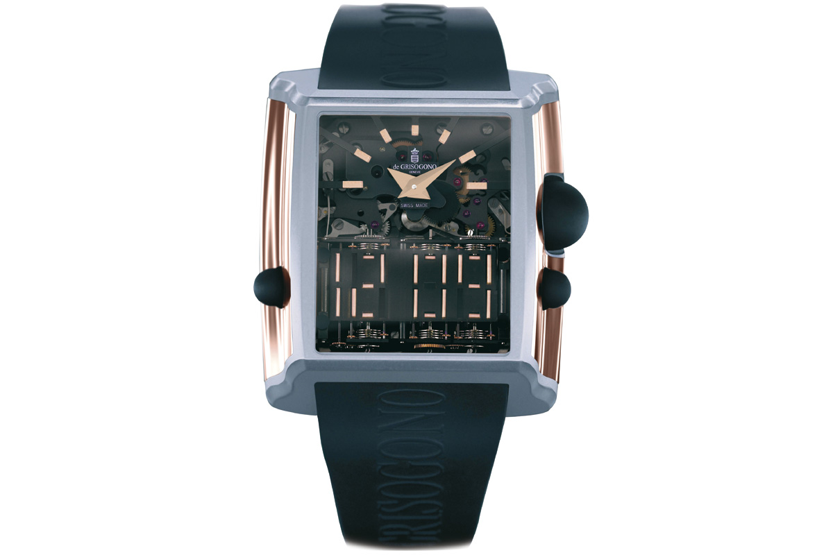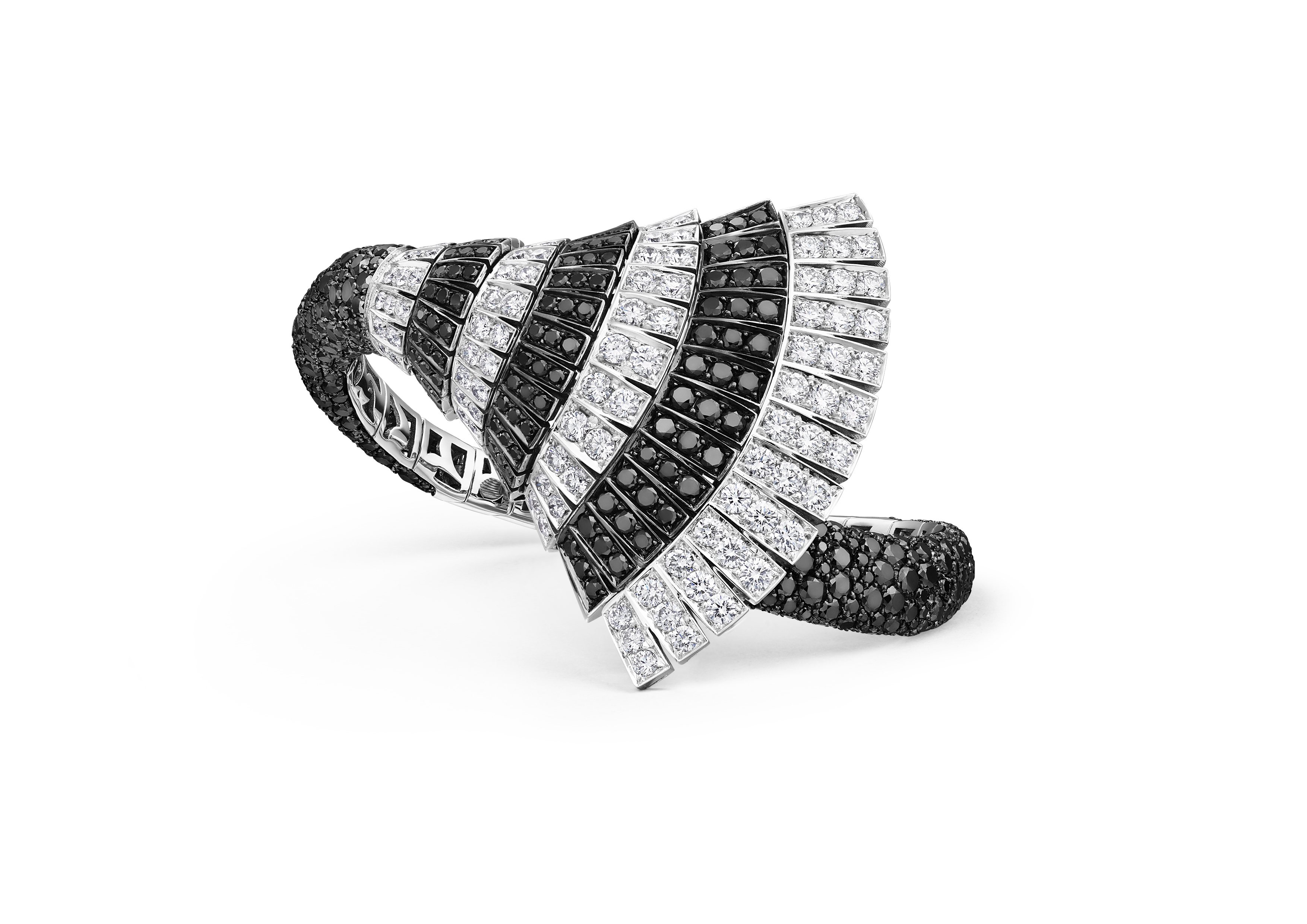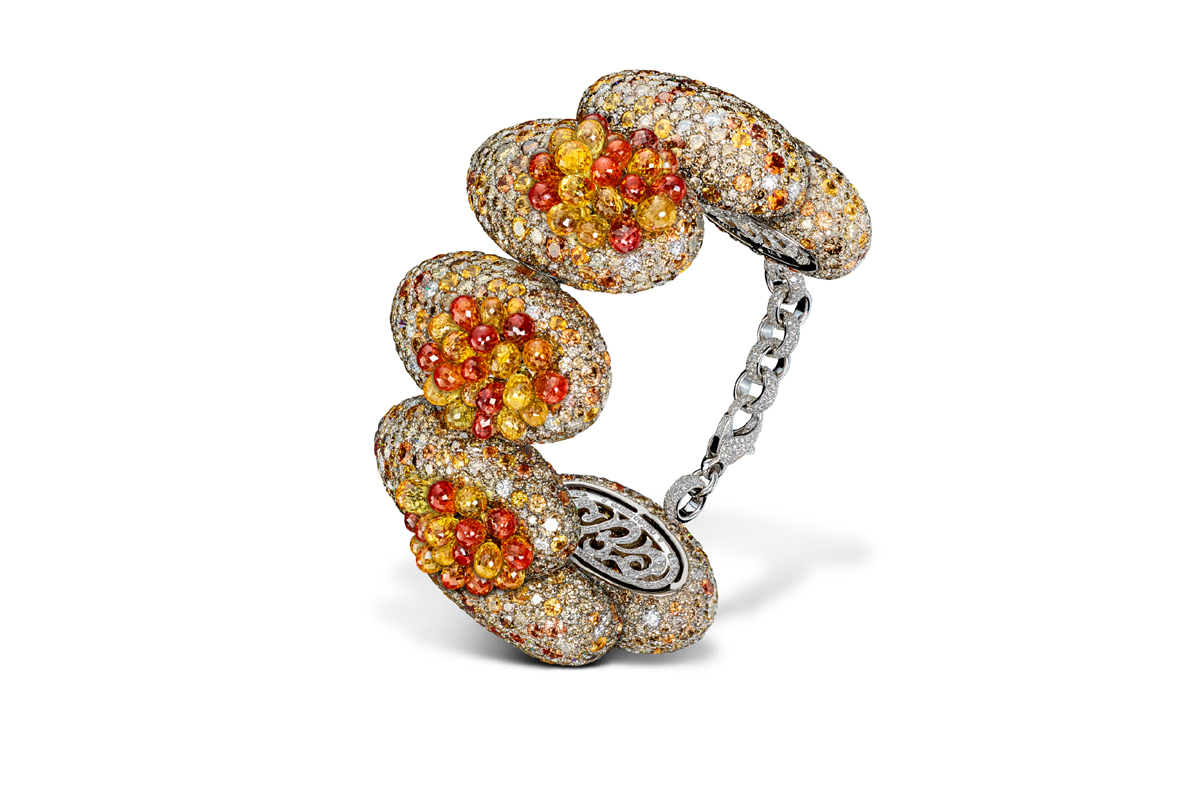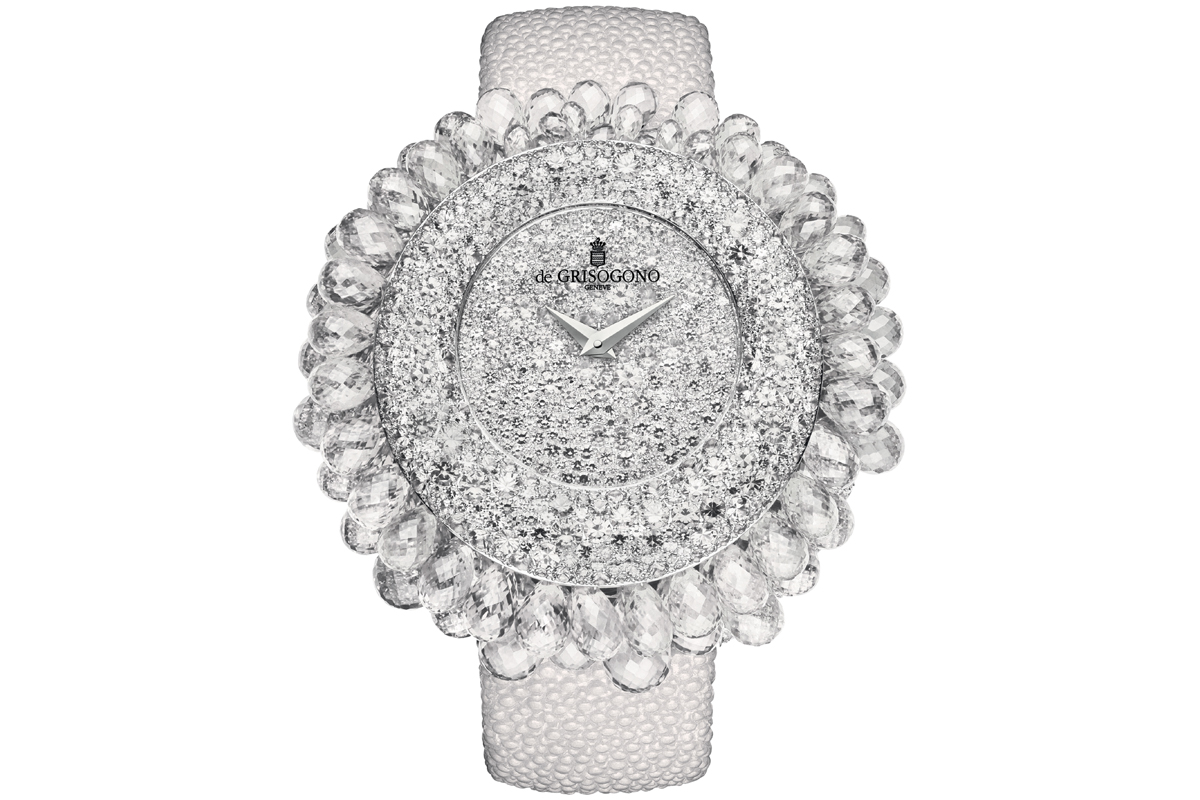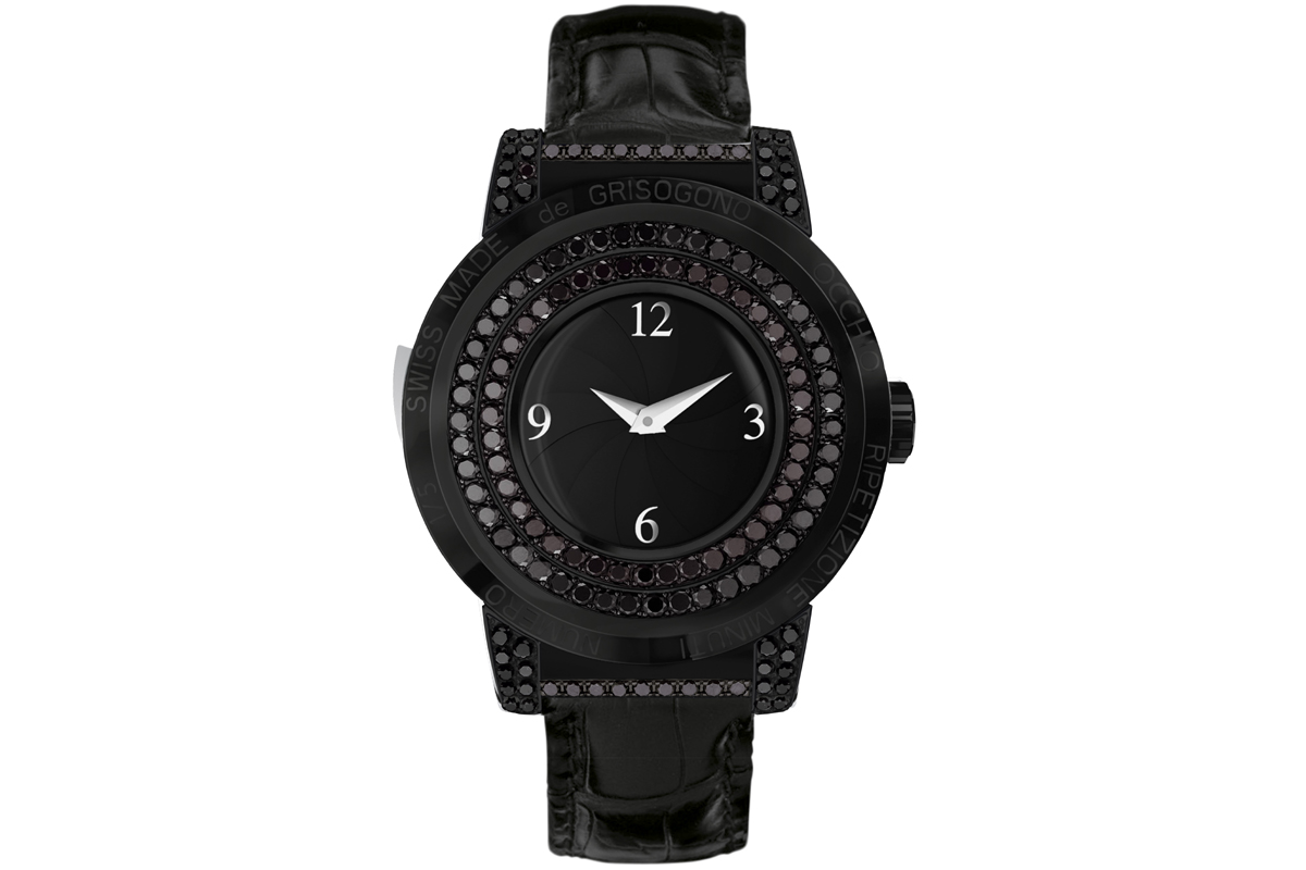 Oggi, il gusto esuberante di de Grisogono è al centro di questa piccola retrospettiva, appunto, che riassume i temi principali del suo percorso creativo in poco più di una ventina di esemplari. Come i diamanti neri, ormai onnipresenti in tutti i segmenti di mercato, ma un tempo poco diffusi perché rari e difficili da tagliare. Il gioielliere ginevrino è stato il primo a utilizzarli, e ha li trasformati in una delle proprie cifre stilistiche, tuttora in catalogo – come rivela per esempio la parure Ventaglio. Oppure il “red carpet”: spettacolari pezzi unici, indossati da dive e divine nelle serate più esclusive. O ancora gli orologi: da un lato (al femminile) veri e propri gioielli che indicano anche l’ora, dall’altro (al maschile) meccaniche giocose, spesso taglia XL, anche arricchite di insolite complicazioni.