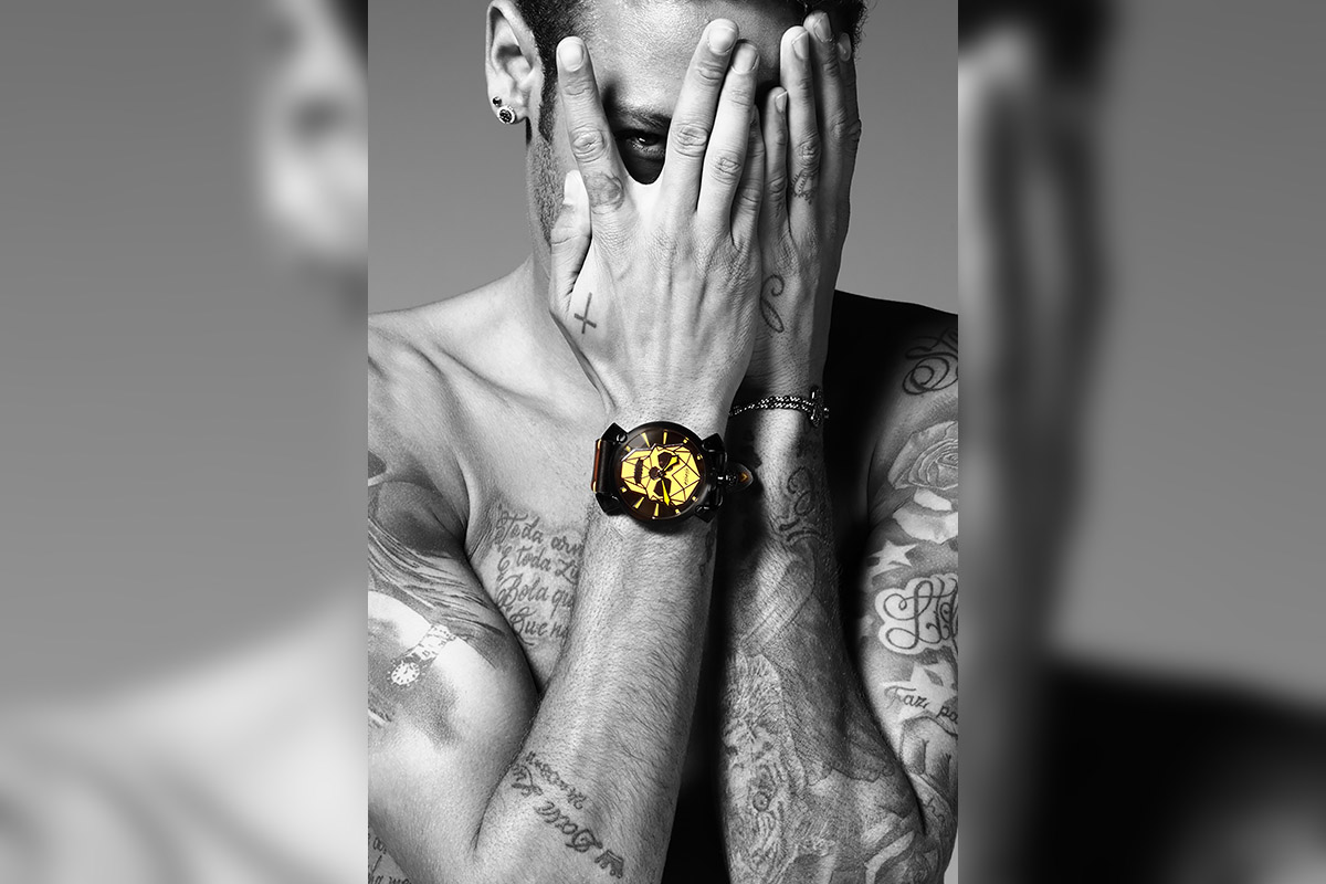 Cassa in acciaio PVD nero (38 mm Ø), impermeabile fino a 5 atm. Movimento al quarzo Swiss made. Quadrante in caucciù, vetro zaffiro, cinturino in caucciù. Nato dalla collaborazione fra il Direttore creativo di Gucci Alessandro Michele e l’artista americano Trouble Andrew. 830 euro.