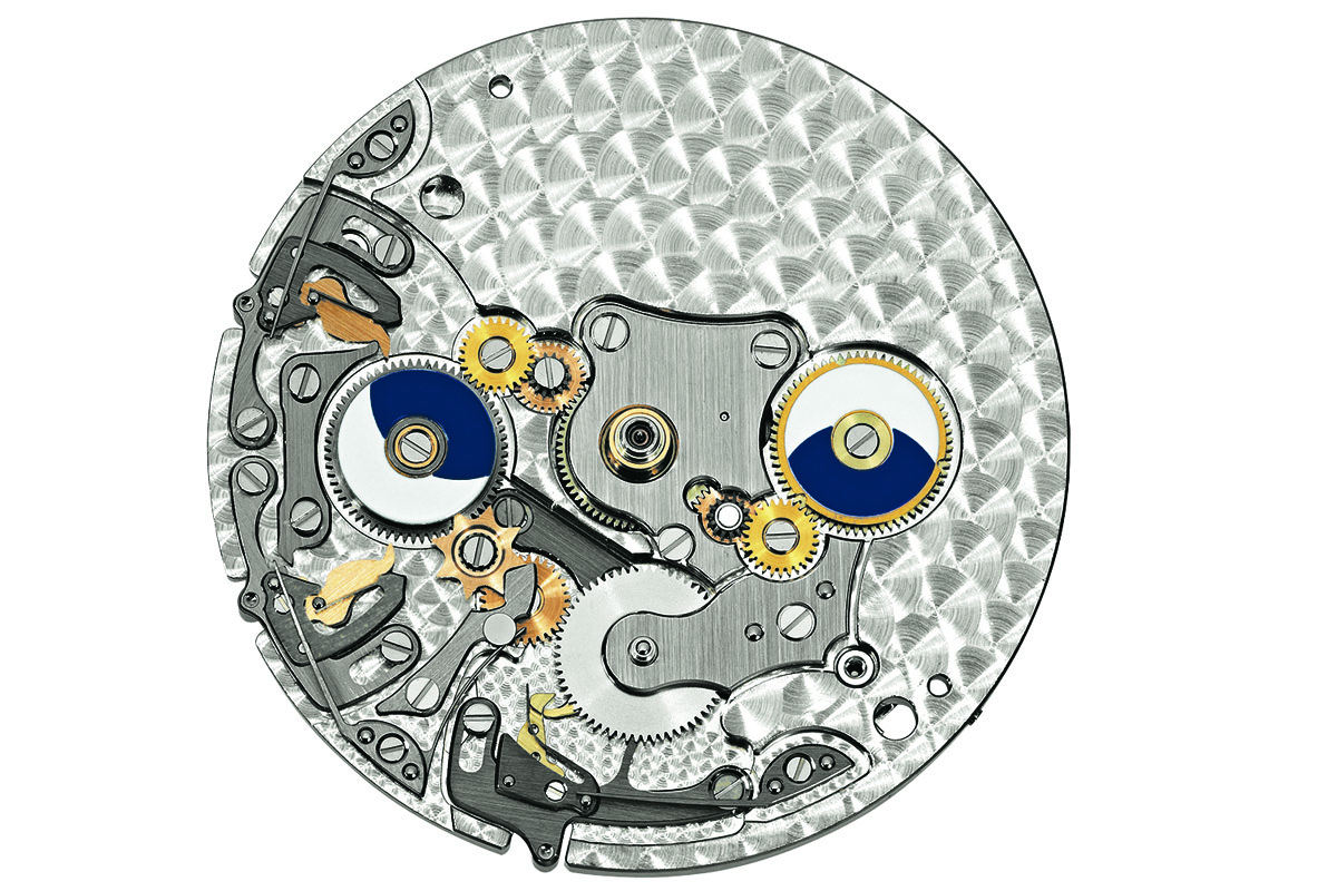 Si tratta di un movimento composto da due parti: il calibro di base più il modulo del doppio fuso orario e del calendario. Visualizza il secondo fuso orario con il consueto sistema della lancetta centrale: che si distingue per la struttura traforata e, quando non si è in viaggio, resta nascosta sotto la “normale” lancetta delle ore. Grazie ai brevetti della manifattura, si può regolare facilmente con i due pulsanti laterali, che la fanno avanzare o arretrare con scatti di un’ora senza incidere sulla precisione dell’orologio. I due pulsanti sono dotati anche di un sistema di sicurezza per evitare manipolazioni accidentali.