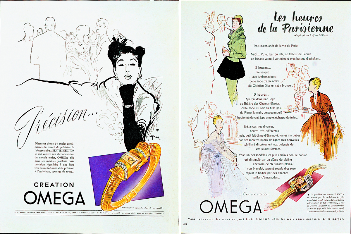 Certo, non una novità nell’industria elvetica delle lancette, che si è sempre servita dell’illustrazione per realizzare una personale ed efficace comunicazione. Basti pensare alle réclame disegnate sui giornali di fine Otto/inizio Novecento, o ai manifesti firmati dai famosi cartellonisti nei decenni successivi. Omega, per esempio, collaborò con grandi artisti come il francese Paul Helleau (1859/1927), lo svizzero Jules-Ami Courvoisier (1884/1936, nato a La Chaux-de-Fonds e figlio di un commerciante di orologi) o il tedesco Carl Moos (1878/1959). Ma anche con i “nostri” Leonetto Cappiello (1875/1942), Mario Gros (1888/1977), e il celeberrimo René Gruau (1909/2004, italianissimo a dispetto del nome: si chiamava Renato Zavagli Ricciardelli delle Caminate e aveva adottato come pseudonimo il cognome della madre).