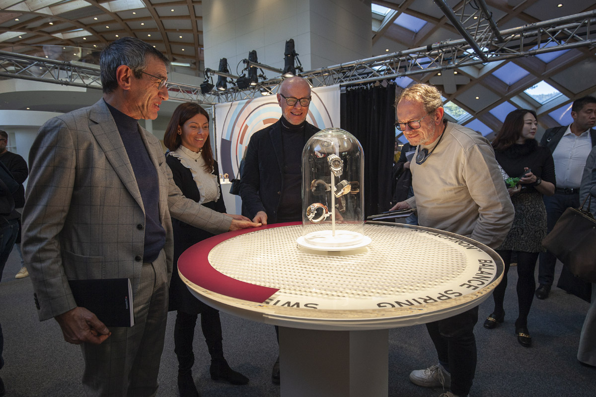 Ci si potrebbe domandare perché andarsi a cercare una complicazione apparentemente inutile o comunque dettata da un capriccio di design. La ragione è che il bilanciere messo in bella vista non è il solito, ma un nuovo organo regolatore con spirale progettata e realizzata all’interno di Swatch Group. Battezzata Nivachron (cui Augusto Veroni, pure lui presente all’evento, ha dedicato uno specifico articolo), è realizzata con un materiale innovativo a base di titanio. Ed è ad alta resistenza contro ogni genere di sollecitazione, soprattutto contro gli influssi negativi del magnetismo sulla regolarità di marcia dell’orologio.
