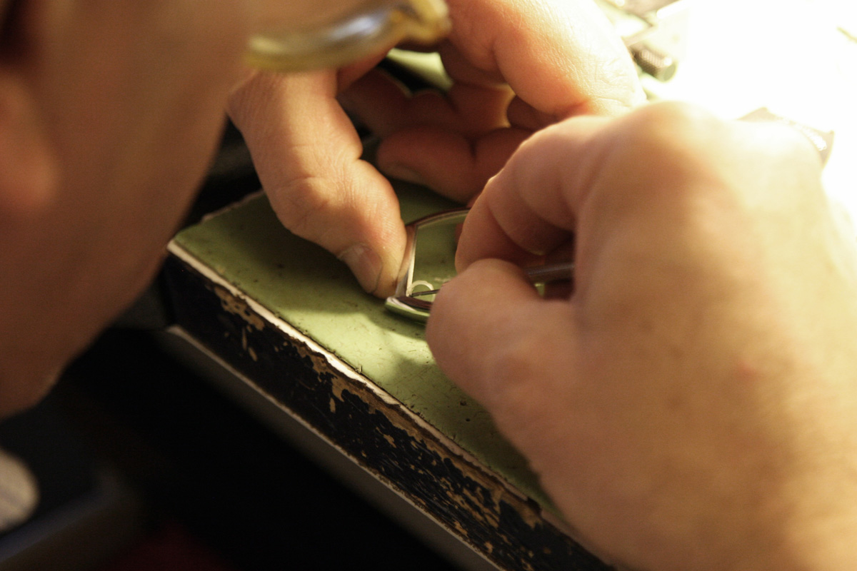 In buona sostanza l’orologio va quindi aperto e poi privato del calibro. A quel punto si procede con un lavoro in parallelo. Da una parte, il vetro. Che va prima di tutto scollato dopo essere stato prima indebolito in un bagno di acqua calda e ultrasuoni. Passo successivo, quello di rimuovere meccanicamente e manualmente ogni residuo di vecchia colla dalla battuta della lunetta (il vetro del Casablanca è incollato e si applica dall’esterno). Dopo aver tolto ogni traccia di umidità con aria calda, si procede infine ad incollare il nuovo zaffiro, tenuto ben saldo nella sua sede da una speciale colla a UV ad altissima tenuta (Loctite 3851), catalizzata con un paio di minuti di esposizione agli infrarossi.