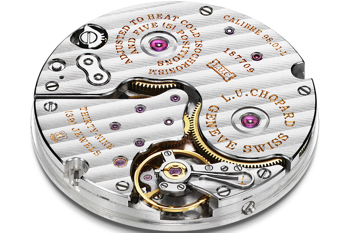 Chiedendo scusa ai tecnici veri per questa spiegazione empirica, vorrei far notare che il calibro L.U.C 98.01-L di Chopard adotta fondamentalmente due accorgimenti di grande valore tecnico, per garantire un forte accumulo d’energia (grande autonomia), un basso consumo e soprattutto una cessione regolare dell’energia. Da un lato un sistema con quattro bariletti collegati in serie e montati in due coppie verticali. Dall’altro una quantità impressionante di perni montati su rubini proprio per diminuire gli attriti e quindi i consumi, garantendo anche una cessione regolare dell’energia.