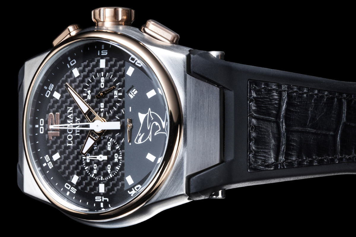 La cassa è in acciaio 316L, una lega di acciaio inossidabile a basso contenuto di carbonio, dall’ottima resistenza alla corrosione e dall’elevato coefficiente di igiene (non a caso è chiamato “acciaio marino” o anche “acciaio chirurgico”). Lunetta e pulsanti sono in acciaio con trattamento Pvd oro rosa, mentre il fondello è in titanio. Certo, la cosa non stupisce più di tanto, perché il mix di materiali è tipico di Locman – che oltretutto è stato un pioniere nell’utilizzo del titanio in orologeria. Ma il fatto è che questo metallo è totalmente biocompatibile, cioè è ben tollerato anche da chi soffre di allergie alla pelle. Il che significa, da parte di Locman, grande sensibilità e considerazione verso chi dovrà indossare l’orologio.
