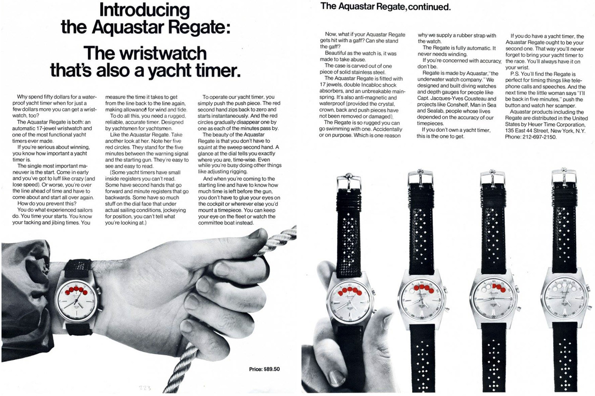 1939, è la volta del primo cronografo da polso impermeabile. 1949, lancio del Solunar, con indicazione delle maree. 1950, lancio del Maréographe, con indicatore di marea e funzione di conto alla rovescia – più noto forse con il nome americano, Seafarer. 1955, lancio del Navia, strumento di bordo per i cruscotti delle navi. 1965, lancio dell’Aquastar Regatta. 1967. Prima partecipazione all’America’s Cup, nel pozzetto dell’Intrepid di Emile Mosbacher (vincitore della competizione). 1972, esce il cronografo Skipper… Può bastare?