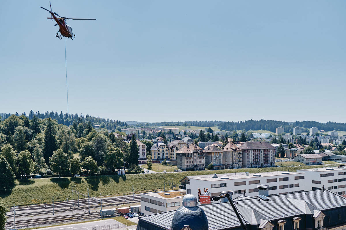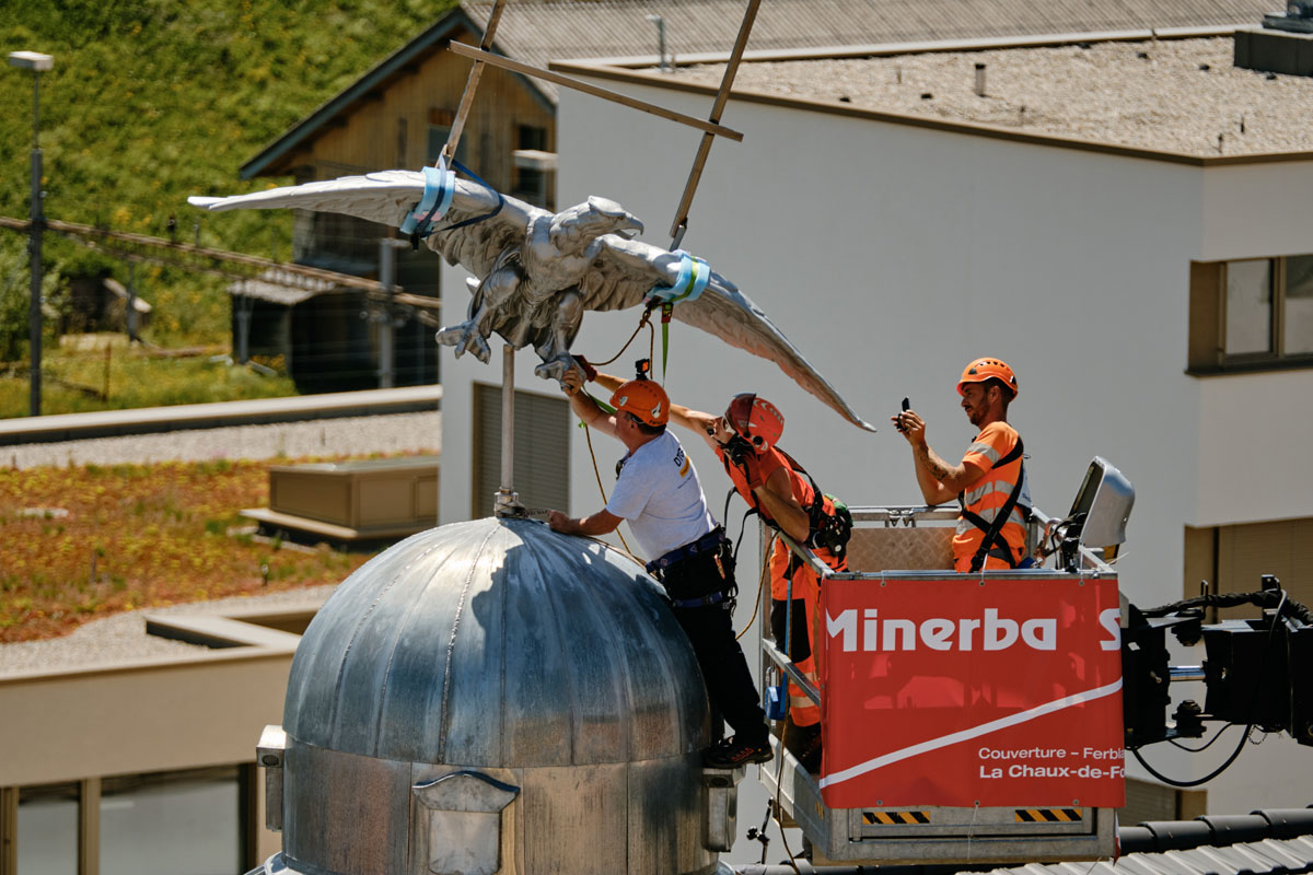 Ma la cosa non finisce lì. Dopo l’inaugurazione del Museo tutti i partecipanti alla cerimonia (fra cui molti dipendenti in pensione, affezionatissimi al “proprio” marchio) sono scesi in strada. Perché l’Aquila ad ali spiegate, selvaggio simbolo di Eberhard, deve tornare sulla piccola cupola che domina l’angolo del bell’edificio di Avenue Léopold-Robert, la spina dorsale di La Chaux-de-Fonds. La statua, una grande fusione di zinco, è stata restaurata come si deve, ed è lucida come fosse nata ieri.