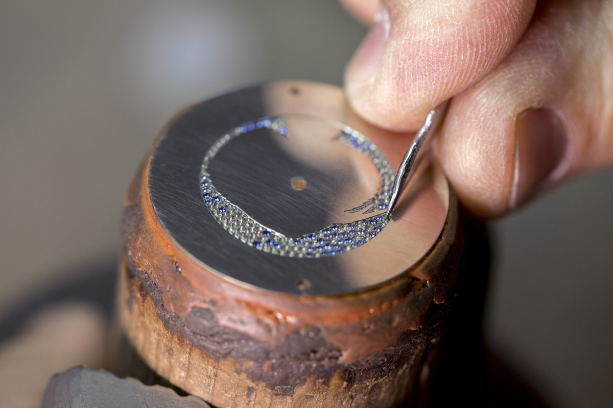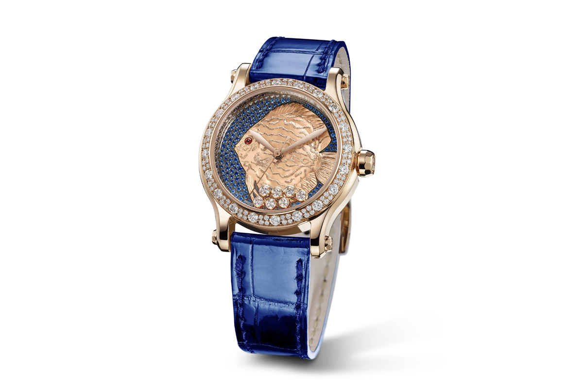 Sono invece 25 gli esemplari dell’Happy Fish di Chopard, che sviluppa un tema caro a Caroline Scheufele fin dal 2002. Nell’ultima versione, uscita lo scorso anno, quello che sembrerebbe un pesce disco (almeno dalle striature) è in madreperla scolpita a mano, in 3D come un sottile bassorilievo; ricoperto con un’impalpabile lamina d’oro, è poi rivestito da un trattamento luminescente che lo fa splendere anche al buio; infine, sguazza in un mare di zaffiri serti neige di varie sfumature, attorniato da sette “bollicine” di diamanti mobili e dalla “spuma” della lunetta tempestata con altri diamanti di diverse carature. Riunisce insomma svariati mestieri d’arte che rivelano tutto il savoir-faire artigianale coltivato “in casa”: incisione, incastonatura, lavorazione a foglia d’oro…
