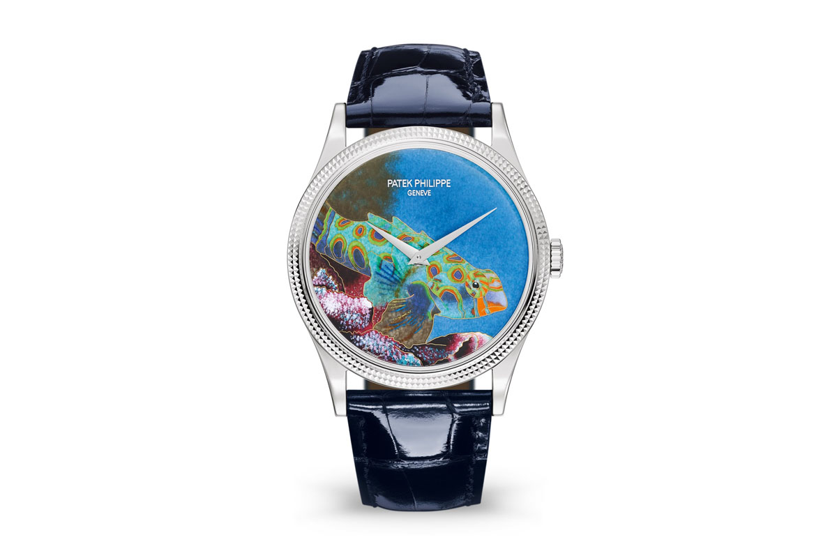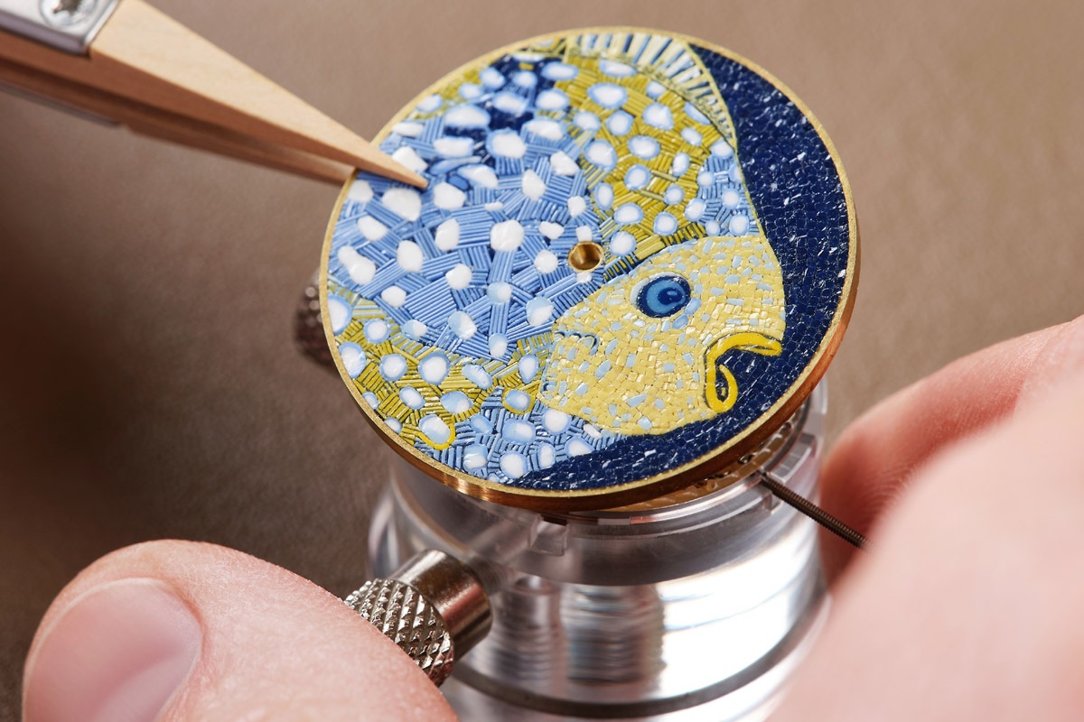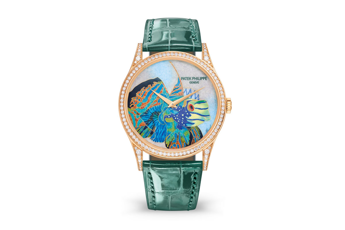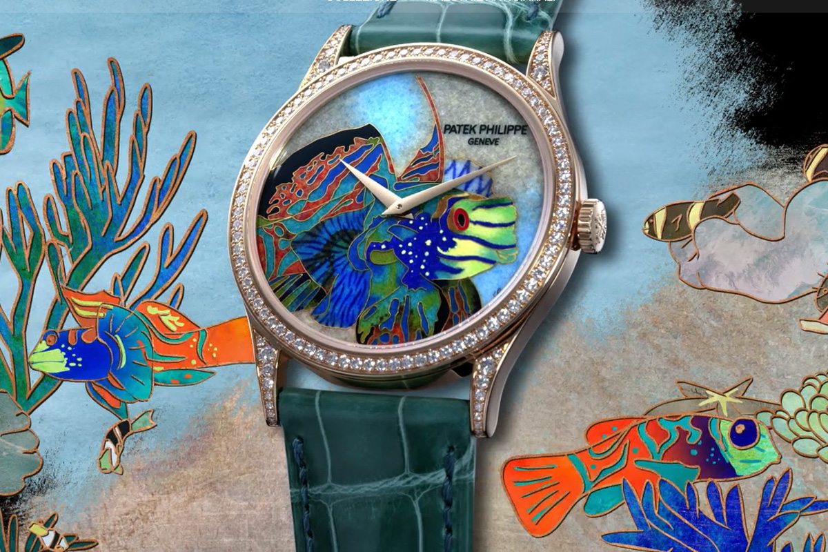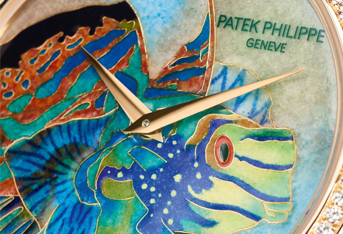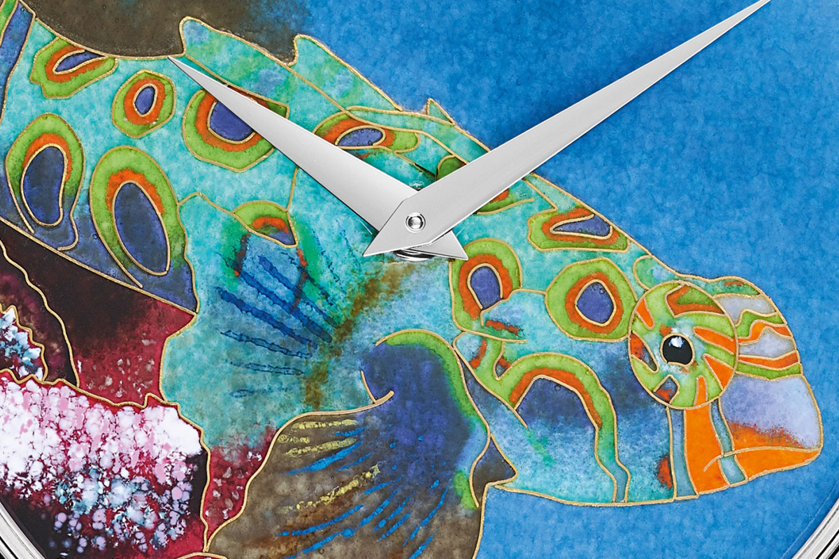 Più fedeli alla tradizione, ma non per questo meno d’effetto, sono quindi gli esemplari di Patek Philippe. Due pesci mandarino di diversa varietà fanno bella mostra di sé nella nuova collezione Maestrie Artigianali: con le tipiche strisce nella versione femminile, a macchie policrome in quella maschile. Entrambi però sono accomunati dall’antica tecnica dello smalto cloisonné Grand Feu. Che prevede vari passaggi: dapprima il maestro smaltatore tratteggia i contorni delle figure con sottilissimi fili d’oro, che formano delle cellette; poi le riempie con un tipo di smalto diverso, per trasparenza e colore; e ogni volta cuoce il quadrante in forno ad alta temperatura, con tutti i rischi e le incognite che ne derivano. Per questo anche i pesci tropicali della manifattura ginevrina sono rigorosamente in produzione limitata.