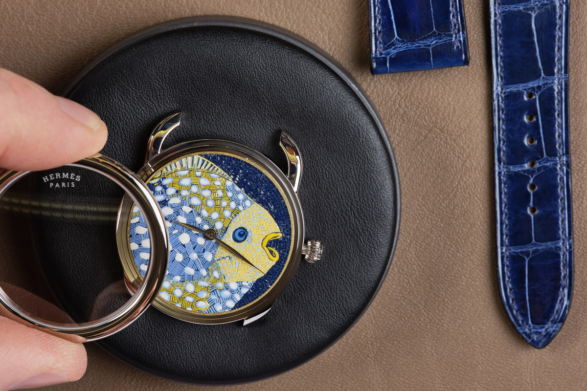 Tra i nuovi arrivi, l’Arceau Grands Fonds di Hermès s’ispira all’omonima serie di foulard dal soggetto “pesci” disegnata da Annie Faivre nel 1992. Non foulard qualsiasi, sia chiaro, ma quei coloratissimi carré di seta per cui qualsiasi donna sarebbe disposta a fare follie… In questo caso, il loro motivo sgargiante è riprodotto con una miriade di microtessere di vetro assemblate a mano, una ad una; con precisione, in modo da rievocare ogni scaglia, ogni riflesso del pesce giallo e azzurro che nuota nel profondo blu. A proposito, dalle macchie potrebbe essere un pesce balestra, ma non ci giurerei… Per tornare al lavoro certosino dei tecnici di Hermès Horloger, ci vuole un mese intero per ogni singolo quadrante. Il che spiega perché l’orologio sia realizzato in una tiratura molto limitata: appena 6 esemplari.