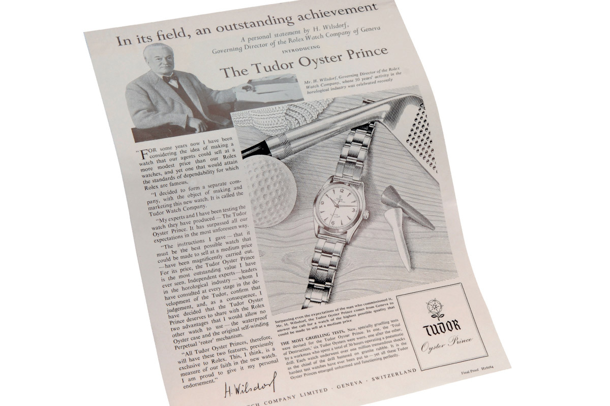 La soggezione di Tudor nei confronti di Rolex non nasce per caso. Per citare Hans Wilsdorf, creatore di entrambe le marche: “Da qualche anno pensavo di fare un orologio che i nostri agenti potessero vendere ad un prezzo più contenuto di Rolex… Ho deciso che il Tudor Oyster Prince meritasse di condividere con Rolex due vantaggi che non consentirei a nessun altro orologio di usare: la cassa impermeabile Oyster e l’originale dispositivo di ricarica automatica Perpetual. Tutti i Tudor Oyster Prince, quindi, avranno queste due caratteristiche precedentemente esclusive di Rolex”. Così si legge in una pubblicità del 1952 sul “Punch”, popolarissimo giornale satirico inglese.