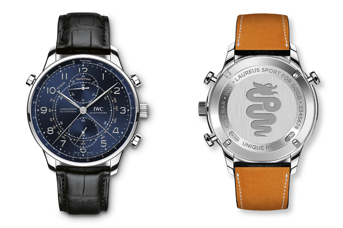 Ok, ma che c’entra tutto questo con gli orologi? C’entra. Perché a promuovere la Laureus F1 Charity Night c’era IWC. E, per la cronaca, all’evento poi hanno poi partecipato anche altre marche del Gruppo Richemont, come Baume & Mercier e Jaeger-LeCoultre. Ma nel ruolo di main sponsor della manifestazione, sotto i riflettori c’era proprio IWC, che ha donato un corso di orologeria e un Portugieser Chronograph Rattrapante. Un pezzo unico, simile all’Edition “Boutique Milano”, ma con la cassa in platino e il fondello personalizzato per l’occasione.