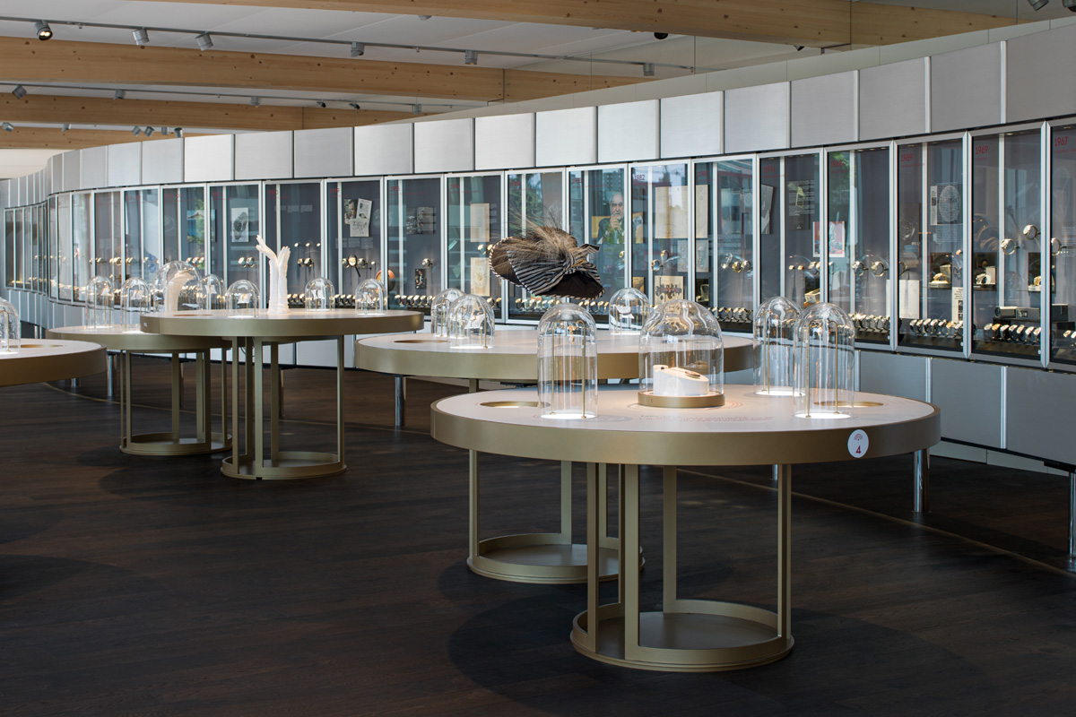 Il nuovo Museo Omega occupa il primo piano dello spettacolare edificio dell’archi-star giapponese Shigeru Ban che si allunga per 240 metri come un lucertolone di acciaio, vetro e legno, collegato alla città da un parco con 120 alberi. Dalla prima bottega aperta a La-Chaux-de-Fonds (1848) all’ultimo record mondiale di immersione a 10,9 metri per l’Omega Seamaster Planet Ocean “Ultra Deep” (2019), la prestigiosa storia del brand è raccontata da un “bracciale” in acciaio.