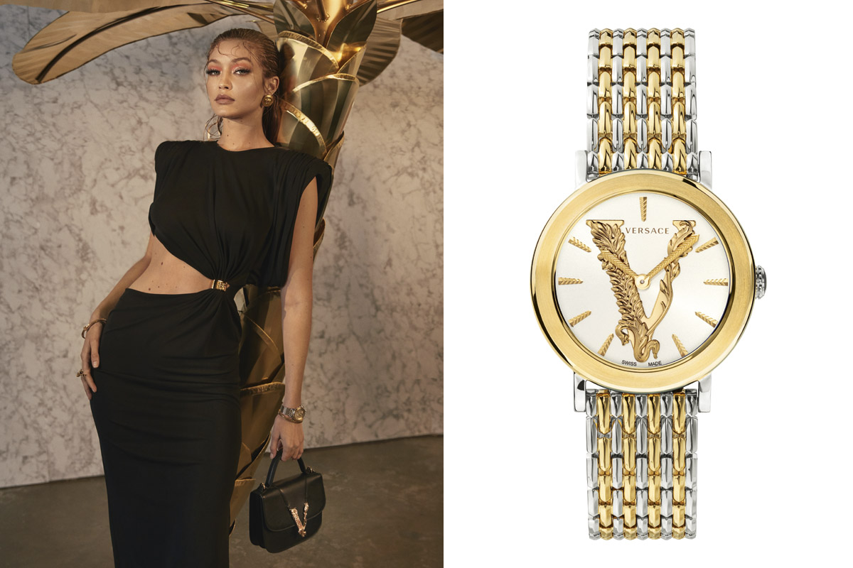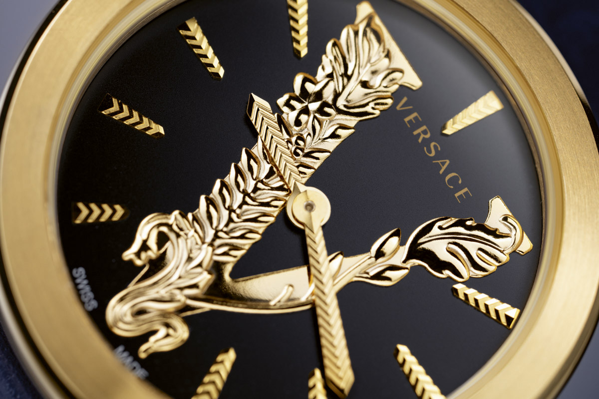 Ecco allora la declinazione timepiece di Versace Virtus in cui, appena sotto al logo a ore 12, la nuova icona del lettering barocco troneggia al centro del quadrante nero o bianco, abbracciato da una cassa sottile. Lady size, sempre in acciaio dorato, gioca con le lavorazioni di superficie: carrure e anse lucide, ma lunetta satinata. Un dettaglio che spezza l’impostazione chic dell’insieme con un accento quasi sportivo. Un tocco inatteso, un po’ spiazzante, tipico di Versace.
