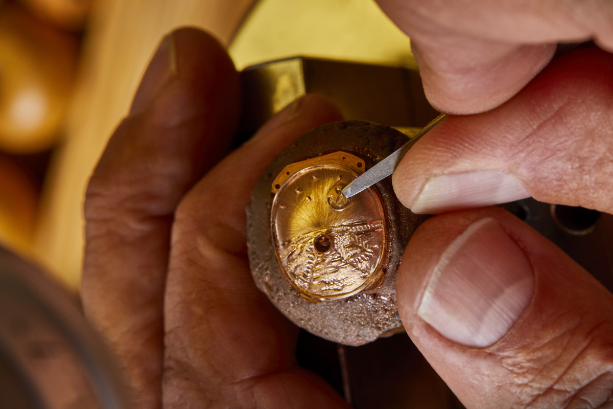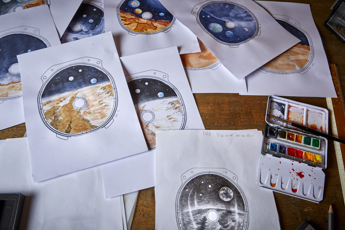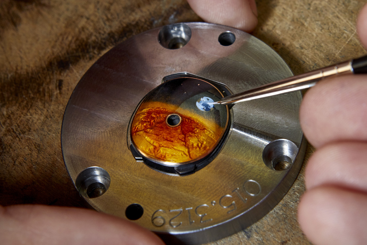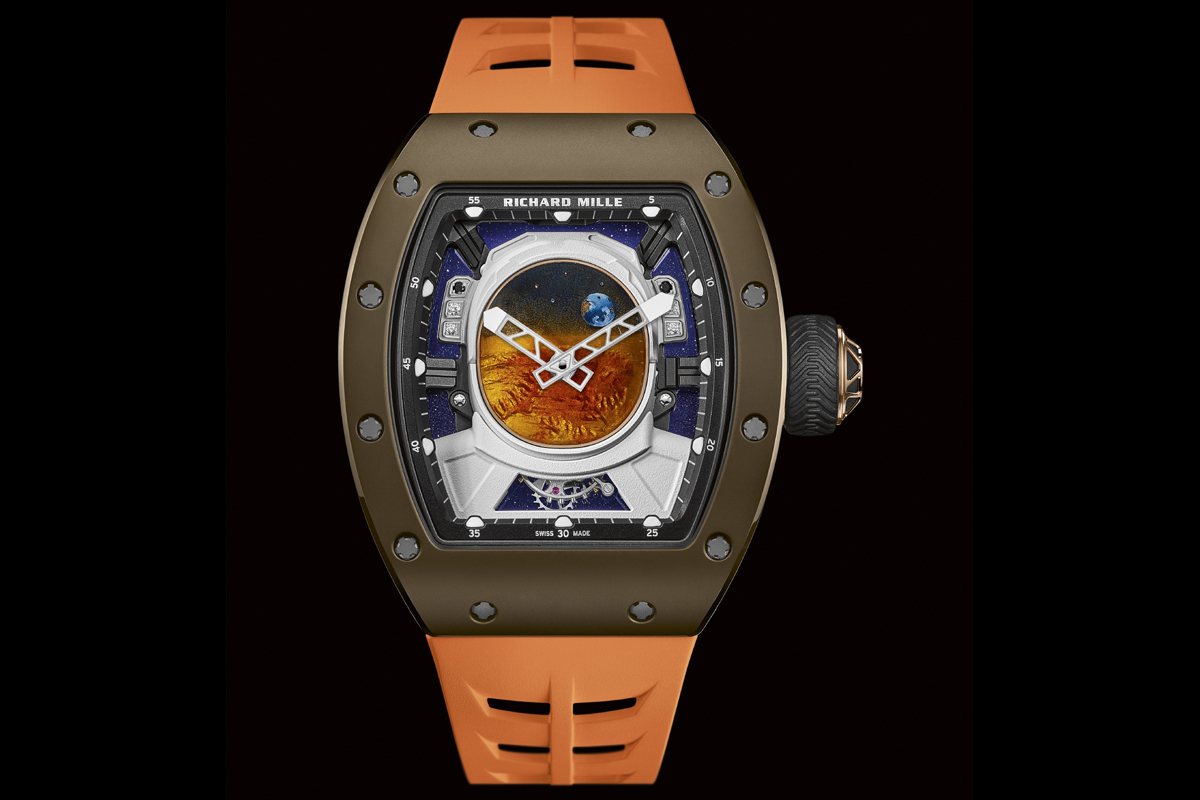 L’équipe di Pierre-Alain Lozeron, infatti, ha utilizzato diversi mestieri d’arte per riprodurre in modo meticoloso l’inedito soggetto. Ovvero il casco di un astronauta, con la visiera che riflette la Terra e il suolo del Pianeta Rosso, sullo sfondo dello spazio cosmico. Ed è proprio la visiera la parte più interessante, perché è il risultato di numerose lavorazioni. In sintesi si tratta di una piastra ellittica in oro rosso, leggermente ricurva, che è stata dapprima incisa a mano con piccoli bulini creati ad hoc; poi smaltata con la tecnica del Grand Feu (complicata ulteriormente dalla leggera bombatura della visiera); quindi dipinta con pennelli sempre di dimensioni microscopiche.