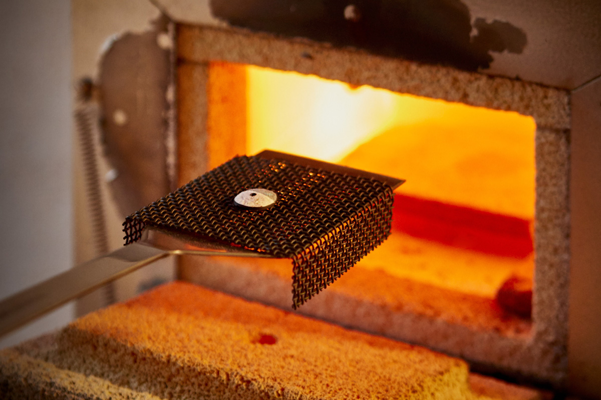 Lo smalto Grand Feu, voglio ricordarlo, è un’antica tecnica di decorazione che si basa sul passaggio in forno ad alte temperature (850° circa). Difficile come tutte le tecniche di smaltatura, si basa sull’esperienza e sulle capacità del maestro smaltatore – aiutato solo in parte dalle moderne tecnologie. Per esempio, il forno con il controllo elettronico della temperatura garantisce sì un’assoluta accuratezza termica, ma non evita i rischi insiti nella cottura stessa: crepe, rigonfiamenti con conseguenti rotture, viraggi cromatici e altri accidenti irreversibili, che causano l’irrimediabile perdita del lavoro. Per cui è necessario eliminare il pezzo e ricominciare tutto daccapo.