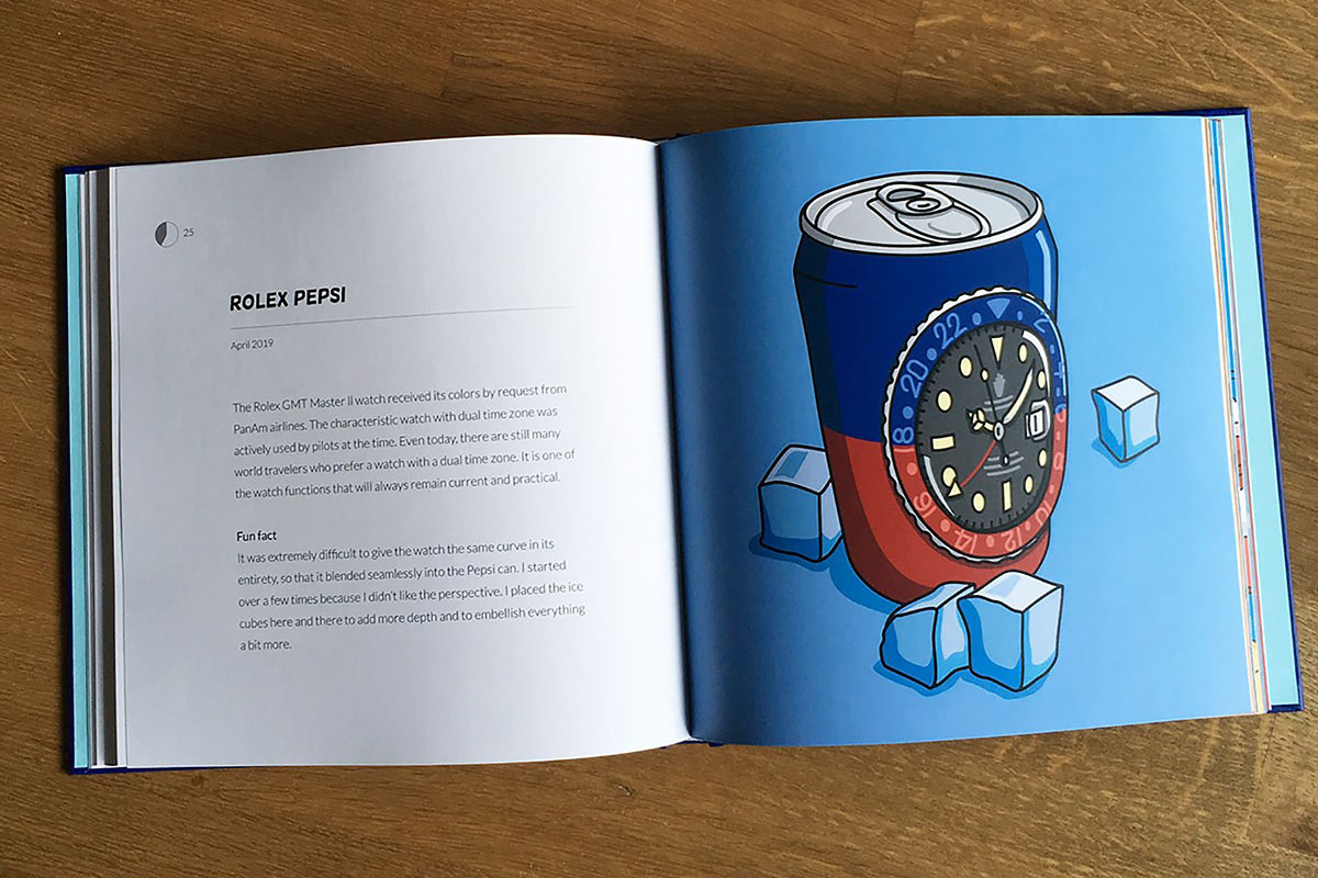A dire il vero, avevo un sacco di hobby ma troppo poco tempo per coltivarli tutti. Da creativo ho cercato di mettere insieme due hobby in uno: il design e gli orologi. Così ho creato il progetto Watches & Pencils. È una piattaforma attraverso la quale creo illustrazioni di orologi con un tocco personale e umoristico. Diciamo che sono illustrazioni fatte da un nerd degli orologi. Alcune sono relativamente semplici, altre richiedono invece una certa conoscenza sul mondo dell’orologeria e sulla sua terminologia.