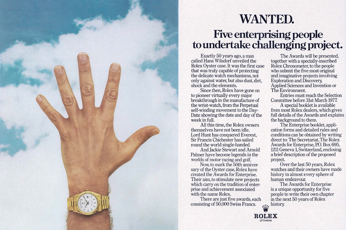 Un impegno che prosegue da più di 40 anni. Era il 1976, quando la Casa della corona istituì i Rolex Awards for Enterprise: un avvenimento per celebrare il 50° anniversario dell’Oyster, il primo esemplare davvero impermeabile nella storia dell’orologeria. L’evento avrebbe dovuto essere un unicum senza seguito, ma ebbe tale successo da spingere André J. Heiniger – all’epoca Direttore generale di Rolex – a trasformarlo in una manifestazione permanente, con cadenza biennale.
