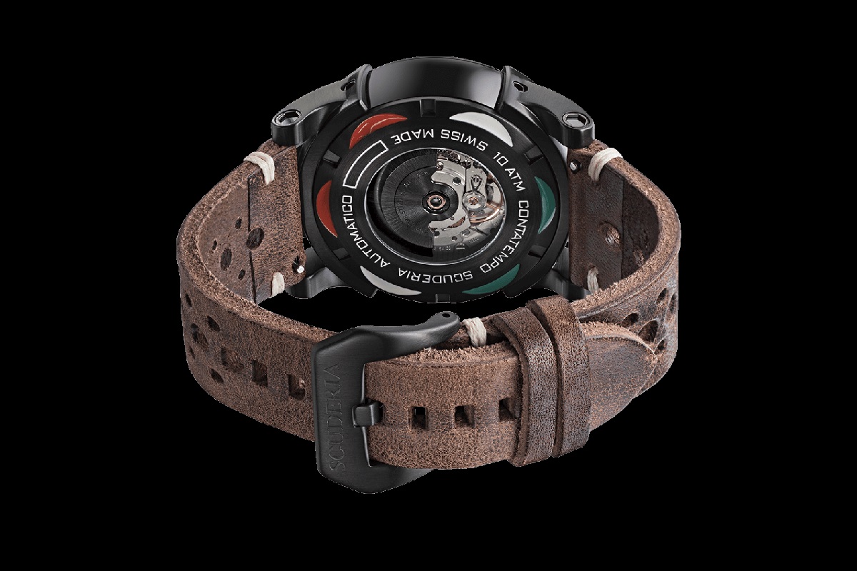 Il “motore” di CT Scuderia Bullet Head Dashboard è (e non poteva essere altrimenti) un movimento meccanico a carica automatica. Il calibro, visibile attraverso il fondello in vetro zaffiro, è un Landeron DP 18. Ciò che si nota subito è la massa oscillante di colore nero; però poi si coglie anche una notevole cura del dettaglio di ogni singola parte meccanica, proprio come in una cafè racer. Il tutto è rigorosamente Swiss made, ma il fondello ci ricorda, attraverso decorazioni bianche, rosse e verdi, che CT Scuderia ha cuore e cervello italiani. Quelli di Enrico Margaritelli che, ancora una volta, fornisce un ottimo esempio di quanto la creatività e la passione (o le passioni, come in questo caso) possano fare.