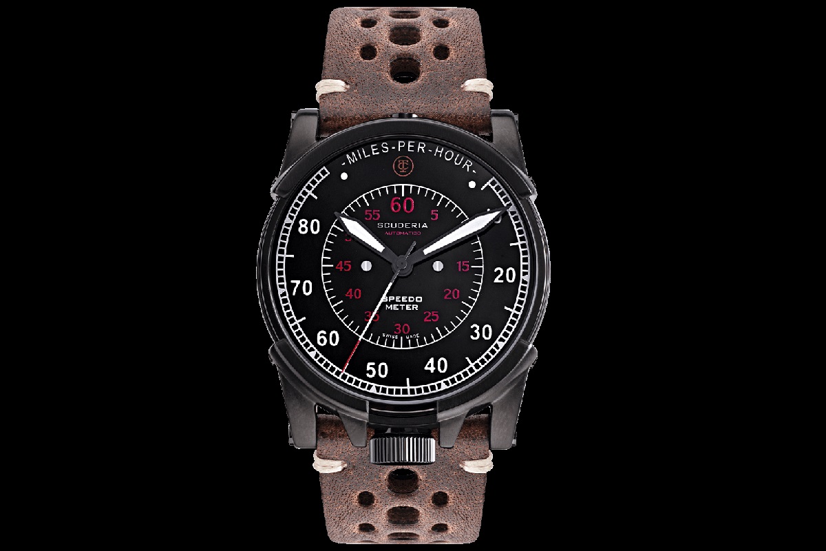 I tratti estetici dei Contatempo di CT Scuderia ricordano la strumentazione di moto (ed auto) da corsa di quegli anni; il modello di cui parliamo, non a caso, prende il nome di Dashboard (letteralmente pannello di controllo) e trae ispirazione dalle mitiche naked inglesi. L’elemento rivelatore è quella che a prima vista potrebbe sembrare una minuteria a chemin de fer; mentre invece è la riproposizione di un tachimetro con scala, molto “British”, in miglia orarie. Oltre alla grafica in bianco, il grintoso quadrante nero ospita anche la minuteria, più interna e di colore rosso, a ricordare il “fuori giri” e a sottolineare ulteriormente la vocazione sportiva dell’orologio. Ore, minuti e secondi, tutti al centro, sono indicati attraverso lancette ad alta visibilità.