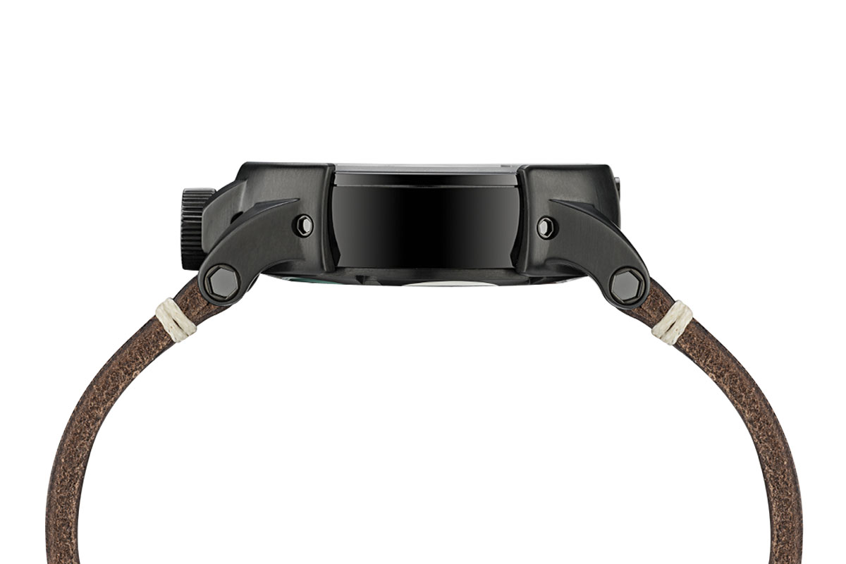Bullet Head Dashboard è il degno compagno di una cafè racer, bello da vedere e dalla forte personalità. Con dettagli che sorprendono: ad esempio la corona di carica alle 6, di generose dimensioni e di colore nero. Idem la cassa: 44 millimetri di diametro e 14 di spessore in acciaio trattato, proprio come i telai in tubi tondi delle veloci due ruote dell’epoca. Due parti in acciaio nero con finitura mat integrano le anse che accolgono un cinturino in pelle, cucito con filo di cotone, e traforato proprio come i guanti indossati dai piloti durante le competizioni. Se si preferisce un altro materiale, nessun problema: gli agganci rapidi consentono di cambiare il cinturino in pochi secondi.