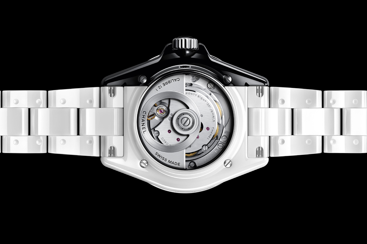 L’anello della lunetta è invece colorato prima di nero e poi ridipinto di bianco, con la parte nera ridotta in modo da creare un perfetto allineamento con l’ansa nera e il bracciale bianco. Di conseguenza, la lunetta del J12 Paradoxe è fissa, anziché unidirezionale girevole come di consueto per gli altri J12. E del resto diversa è anche l’impermeabilità dell’orologio: che ora è garantita fino a 3 atmosfere, mentre di solito raggiunge le 20 atmosfere.