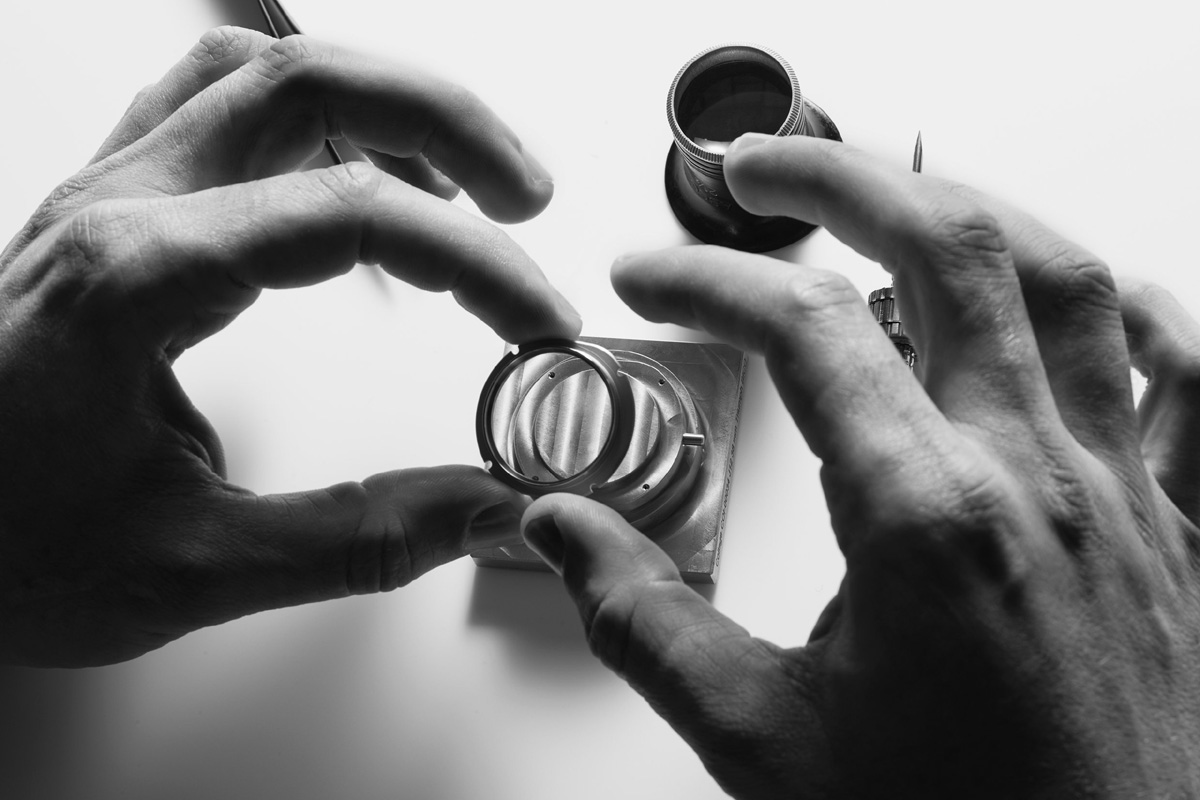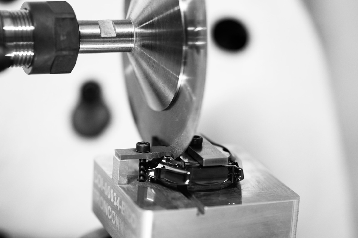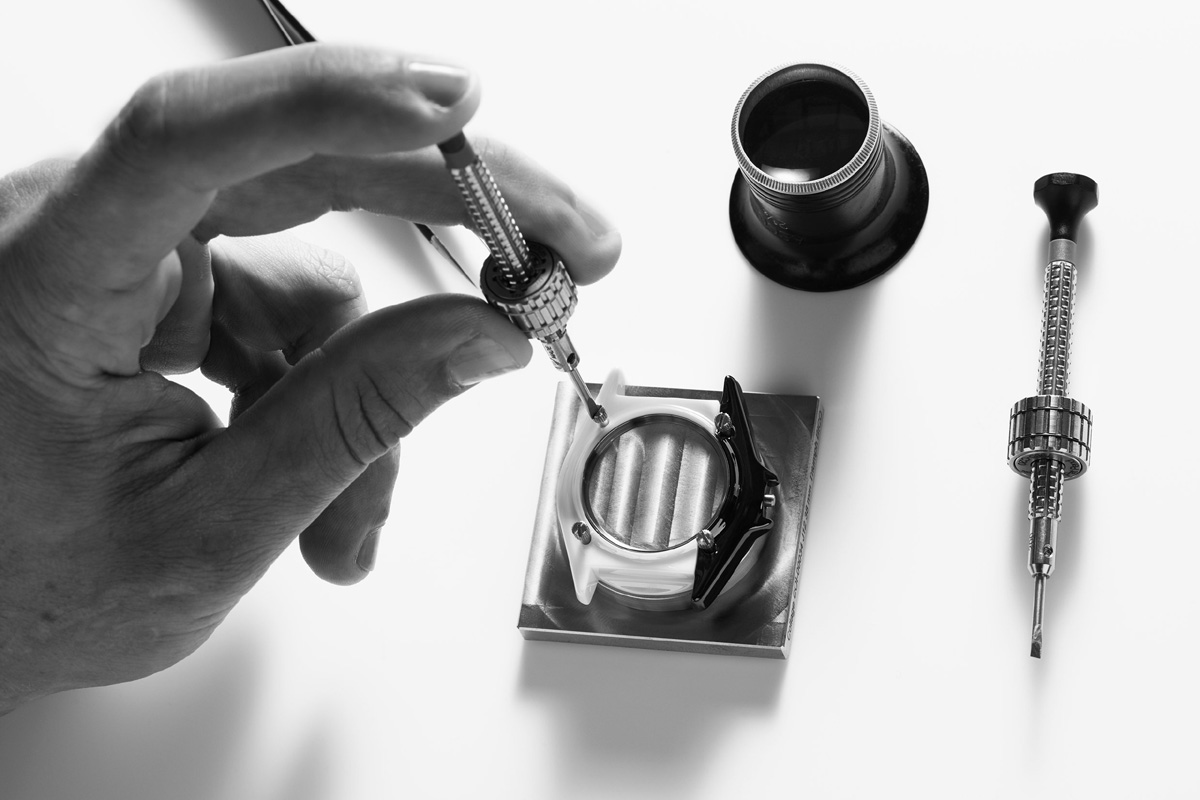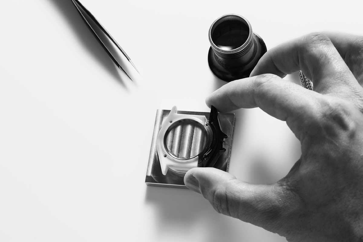 Il che potrebbe anche non sembrare chissà che, se non fosse che la cassa in questione è fatta di ceramica ad alta resistenza. Un materiale estremamente duro, quindi difficile da lavorare e ancor più da tagliare. Per ottenere nella ceramica un taglio perfetto al micron, senza scheggiarla né rovinarne la superficie in alcun modo, bisogna usare frese ad alta velocità; applicate però alla giusta pressione, con grande attenzione al calore e alle vibrazioni, per evitare micro-fratture, deformazioni plastiche o usura da intaglio. Si tratta insomma di un’ulteriore dimostrazione di quanto i tecnici di G&F Châtelain siano in grado di padroneggiare la ceramica.