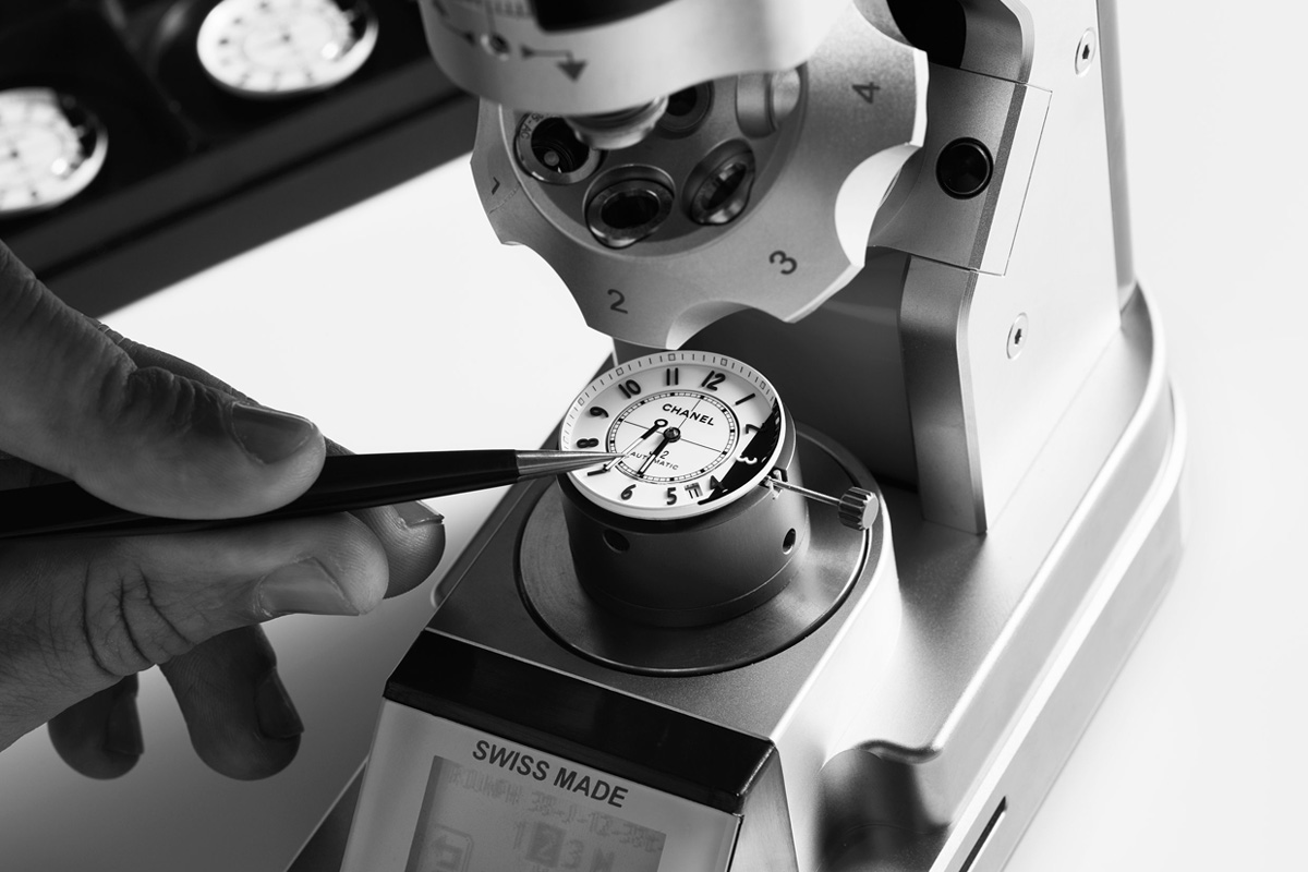 Una volta tagliate, le due parti di colore diverso sono quindi montate insieme in un supporto metallico, in cui verrà poi inserito anche il fondello in vetro zaffiro. Si passa poi agli altri componenti della cassa: il quadrante, i numeri arabi e l’inserto della lunetta – anch’essi bicolori. Mentre i numeri arabi sono realizzati in ceramica nera, ad eccezione del 3 che è bianco, il quadrante e la lunetta sono dipinti con stampa a tampone. In particolare, il quadrante è colorato interamente di bianco, quindi ridipinto di nero nella sezione di destra.
