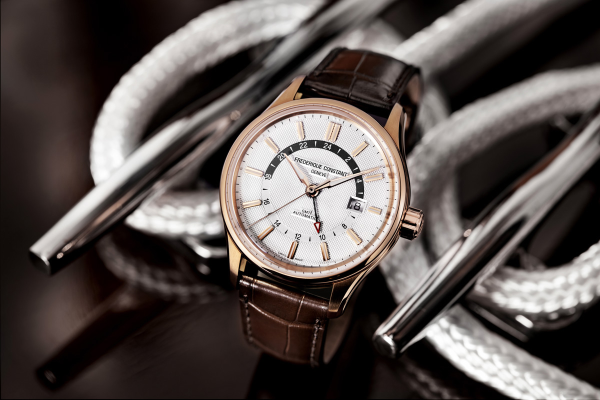 FREDERIQUE CONSTANT Yacht Timer GMT Cassa (42 mm) in acciaio Ip oro rosa, impermeabile fino a 10 atm. Movimento meccanico a carica automatica, calibro FC-350 con modulo realizzato in-house, indicazione di doppio fuso orario a lancetta centrale sulle 24 ore e datario. Quadrante guilloché, indici applicati, lancette luminescenti, vetro zaffiro, fondello trasparente, cinturino in pelle di alligatore. 1.990 euro