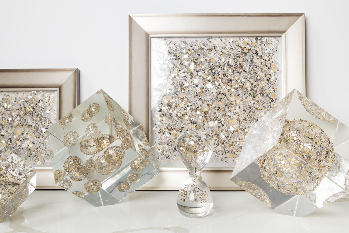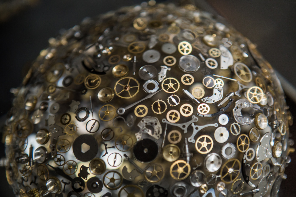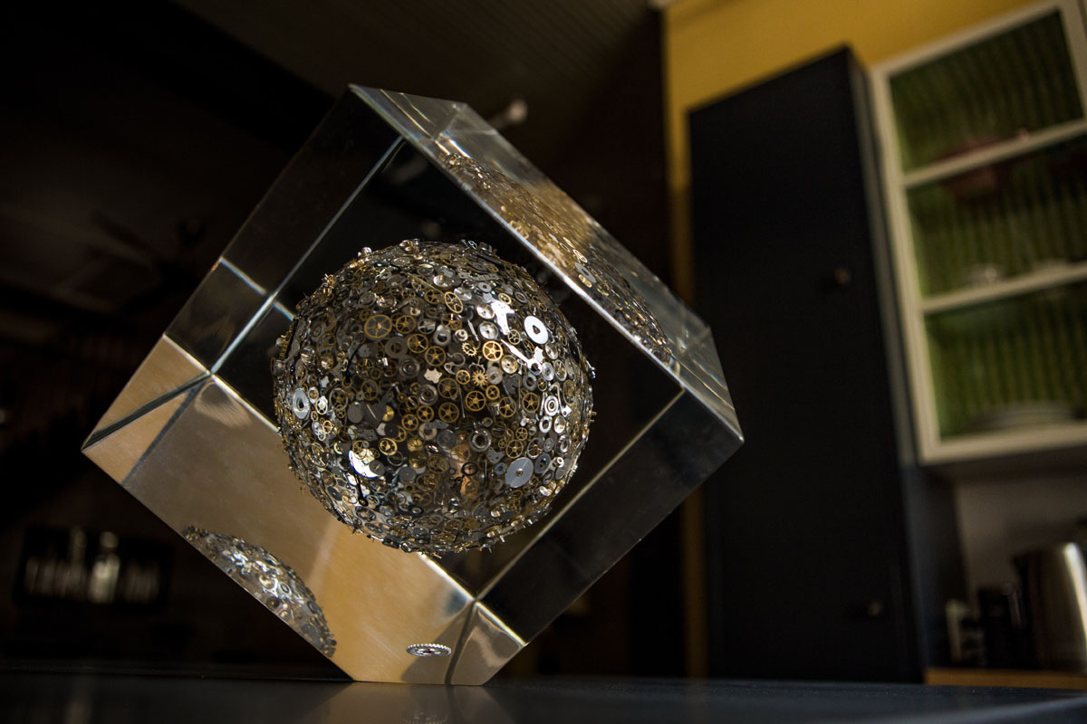 Le opere di Berd Vay’e sono infatti in Lucite®, nome commerciale per un tipo di polimetilmetacrilato – in poche parole plexiglas. Nel materiale sintetico, che riproduce alla perfezione la trasparenza del vetro, incapsulano, esponendoli così a vista, una miriade di ingranaggi di orologi. L’effetto è di grande suggestione, anche perché ogni opera conta migliaia di microcomponenti: ruote, rubini, leve, bilancieri, viti, rocchetti, molle e spirali… Che sembrano, appunto, sospesi nello spazio e nel tempo.