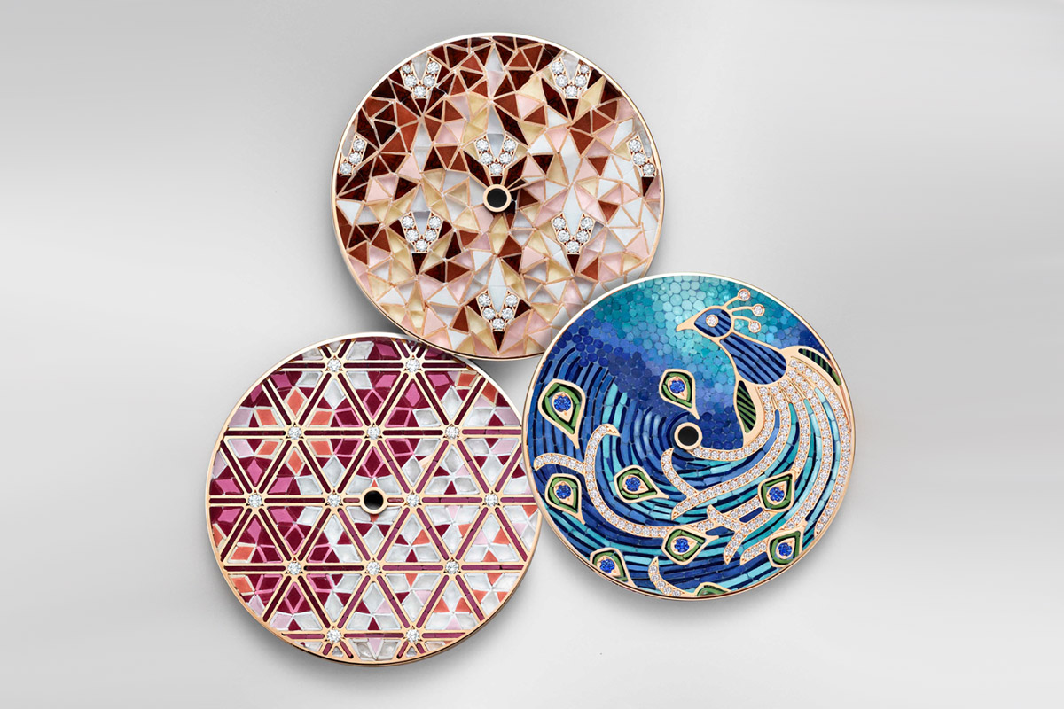 Si tratta di un esemplare che mostra sul quadrante un micromosaico raffigurante un pavone, in versione azzurro-verde su oro bianco oppure nei toni del porpora su oro rosa. Fin qui nulla di nuovo, perché sia il micromosaico sia il pavone sono vecchie conoscenze in gioielleria. Però in questo caso nulla è privo di un significato “terzo”: e tutto si apre invece a scenari più profondi e affascinanti.