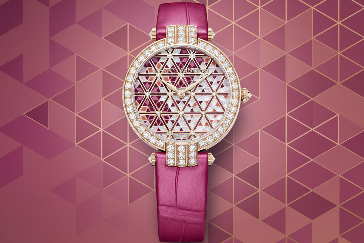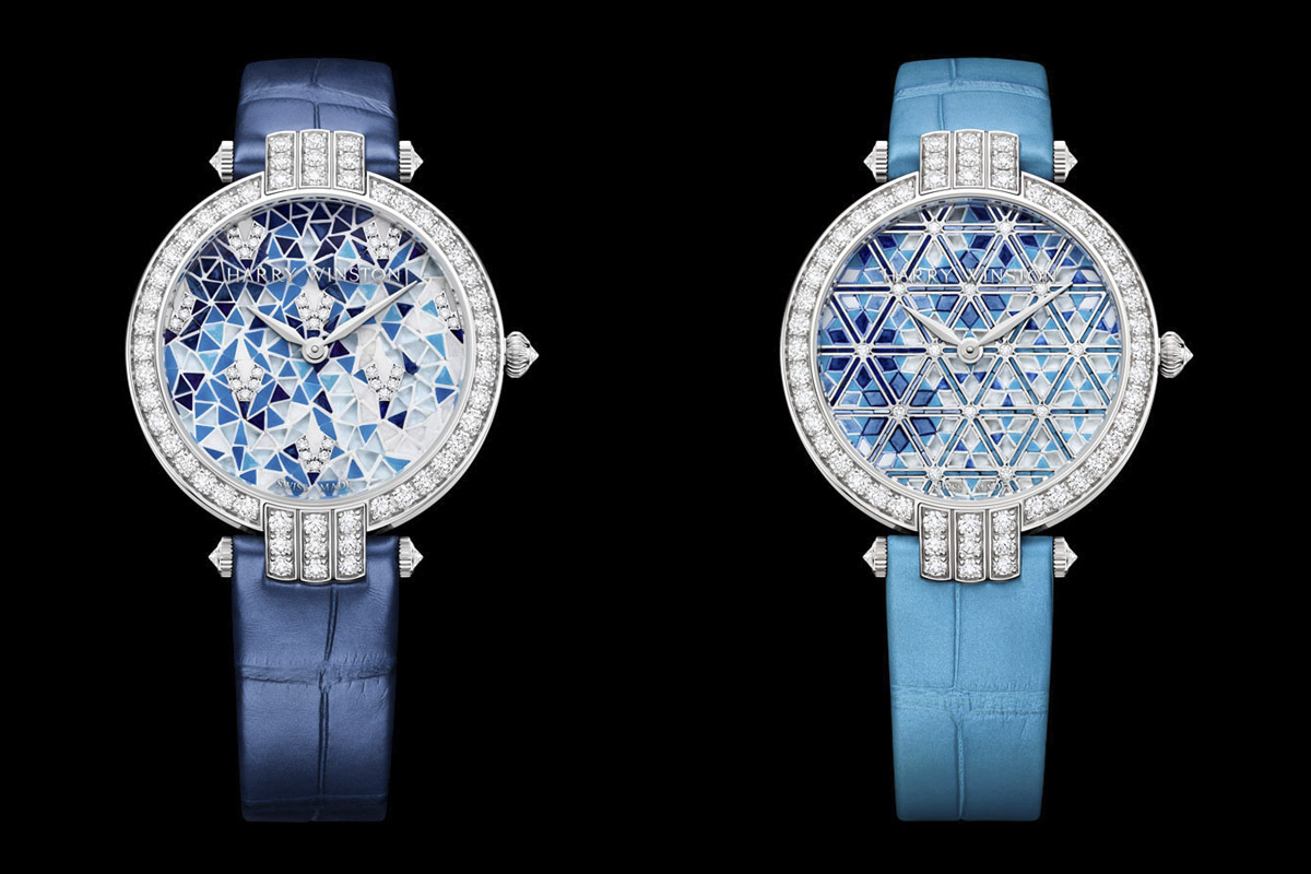 Nel nuovo orologio Premier Precious Peacock il pavone è stilizzato, asimmetrico. Una macchia di colore in cui la coda, aperta a ruota, forma una raggiera di micro-tessere in vetro colorato dégradé, punteggiata dai caratteristici “occhi” in zaffiri blu (versione azzurra) oppure in rubini (versione porpora). A illuminare il tutto ecco 152 diamanti inseriti nel micromosaico in modo analogo alla tecnica del cluster, un brevetto di Harry Winston.