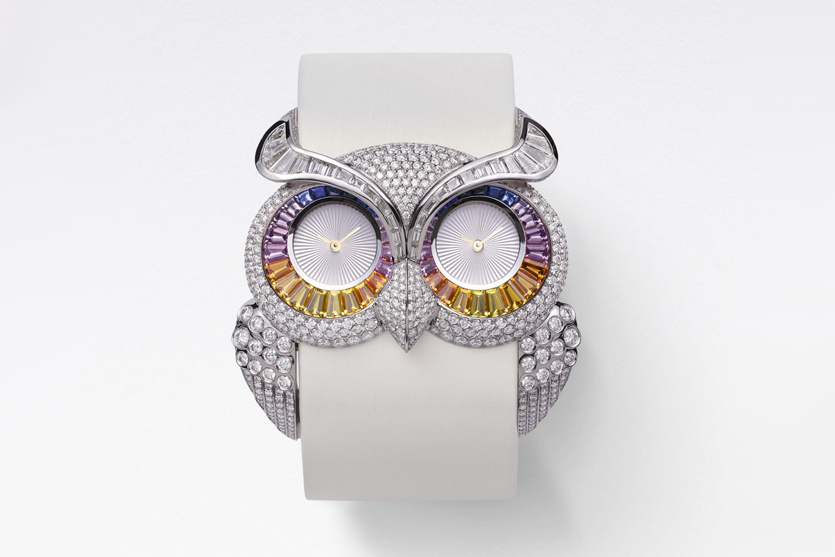 Quest’anno uno dei pezzi forti sarebbe stato Il Gufo, un modello fiabesco, con un doppio quadrante circondato da zaffiri multicolore per richiamare gli occhi dell’animale notturno. Non potendolo (per ora) ammirare al polso di qualche celebrità, ci si può comunque consolare ripensando alla Red Carpet Collection dell’anno scorso; di cui è rimasta memorabile – fra i tanti pezzi unici – l’ampia manchette arricchita da 60 carati di diamanti effetto pizzo, con otto diamanti taglio marquise disposti a rosa dei venti sul quadrante in madreperla.