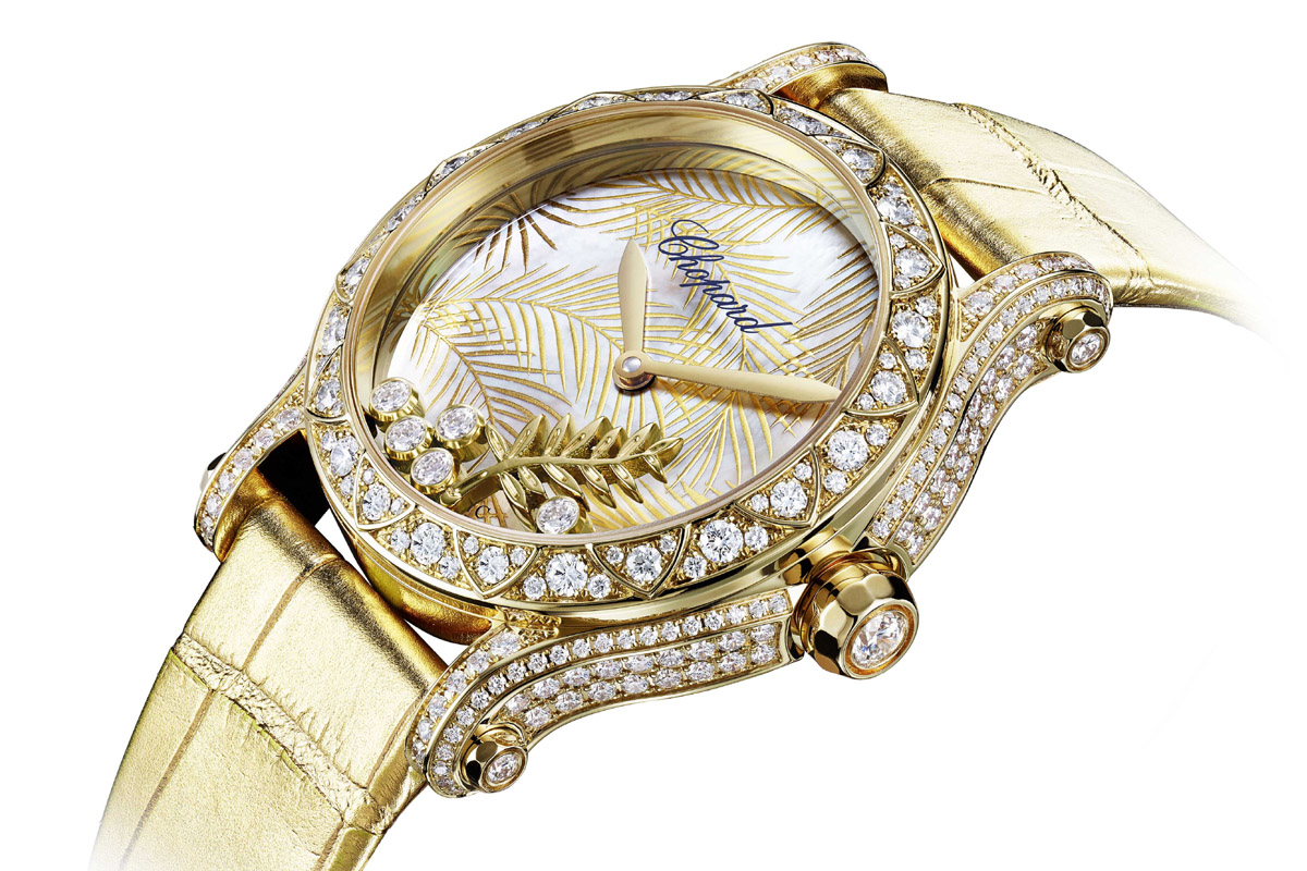 O all’Happy Palm, lanciato al festival di Cannes 2018 e realizzato in oro etico certificato Fairmined (come la Palma). In cui cinque diamanti e una palma in miniatura si muovono liberi sopra il quadrante in madreperla; in alternativa al cinturino in alligatore e oro 24 carati, un bracciale interamente tempestato di diamanti. Mentre il movimento è impreziosito da una decorazione di palme d’oro, incisa a mano secondo la tecnica di Fleurier.