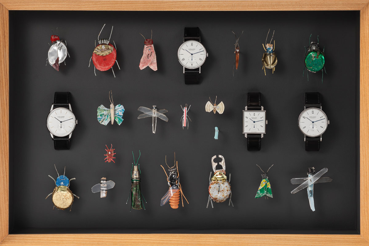 In questo caso, ecco un inedito tableau di insetti e orologi. Così Matthias Garff, come un entomologo d’altri tempi, interpreta l’arte orologiera di Nomos Glashütte. L’artista svizzero è noto per le “sculture” a forma di insetti che realizza con materiale di recupero: carta, tappi, cavi isolanti, involucri di caramelle… E che poi colleziona in cassette entomologiche, memoria delle ottocentesche Wunderkammer che di recente hanno ispirato anche il progetto espositivo “Il sarcofago di Spitzmaus e altri tesori” di Wes Anderson a Milano.
