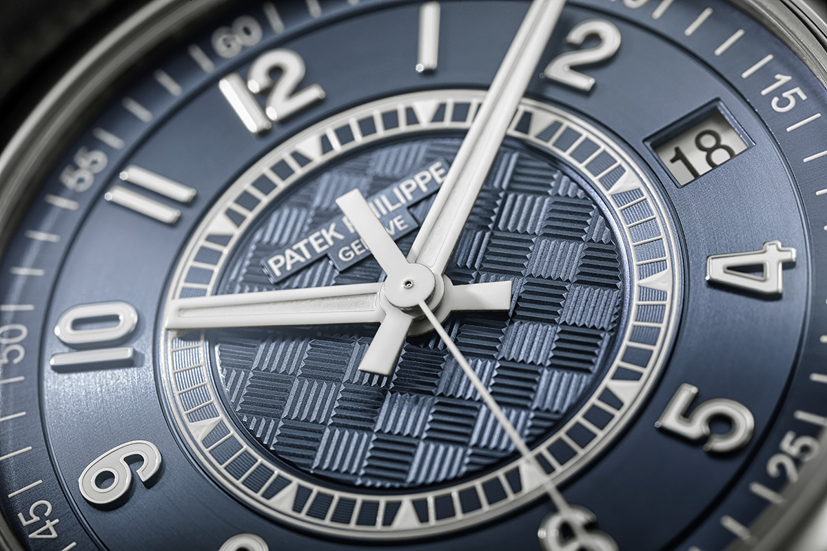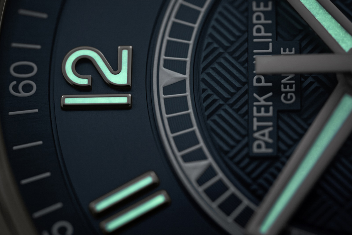 Noto nella parte centrale del quadrante blu un motivo guilloché realizzato con qualità superlativa (un’ulteriore rarità, per i rari modelli in acciaio), che Patek aveva già utilizzato in passato. E noto che le lancette sono ben trattate di materiale luminescente. Se poi aggiungiamo che il materiale luminescente è usato con generosità anche sugli indici applicati, il sospetto (o la sola speranza) di un modello ad alta impermeabilità diviene ancor più forte.