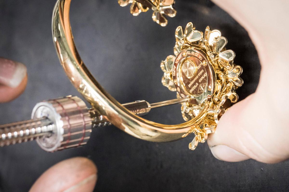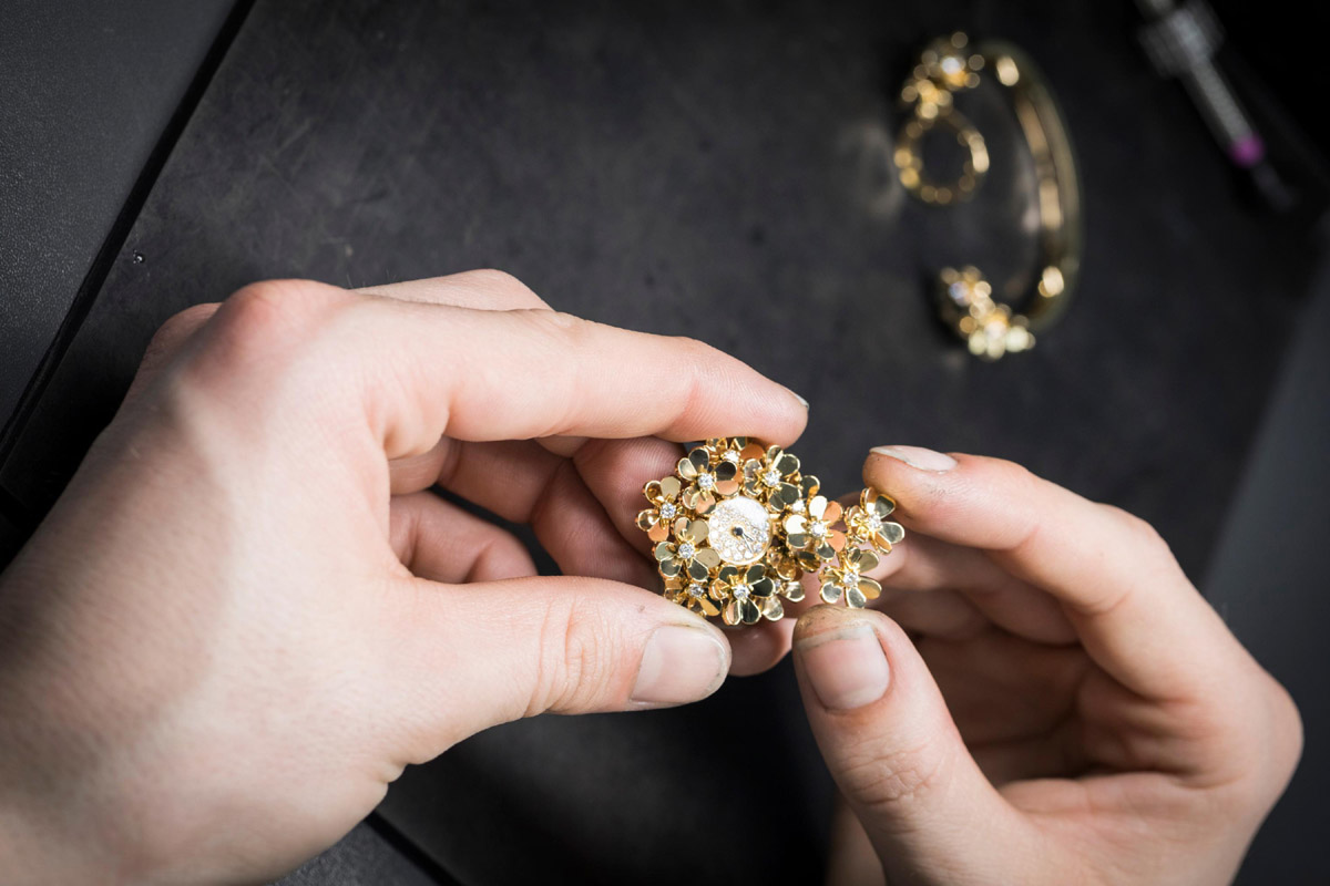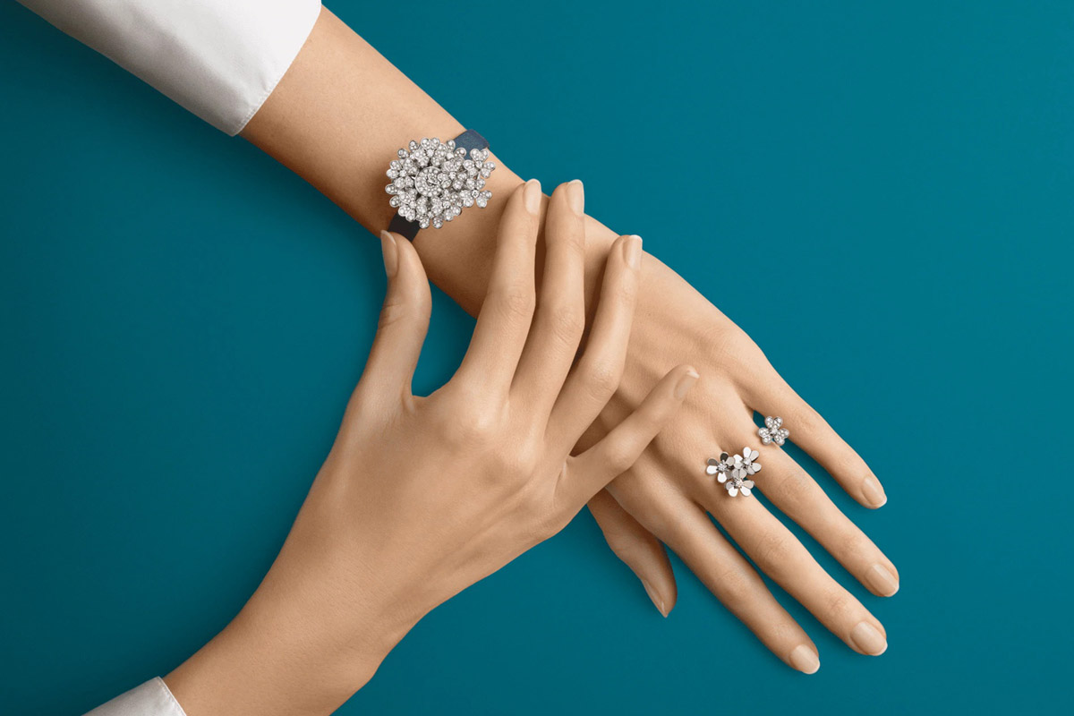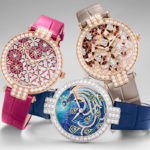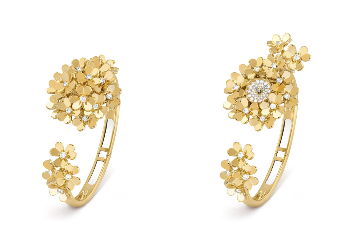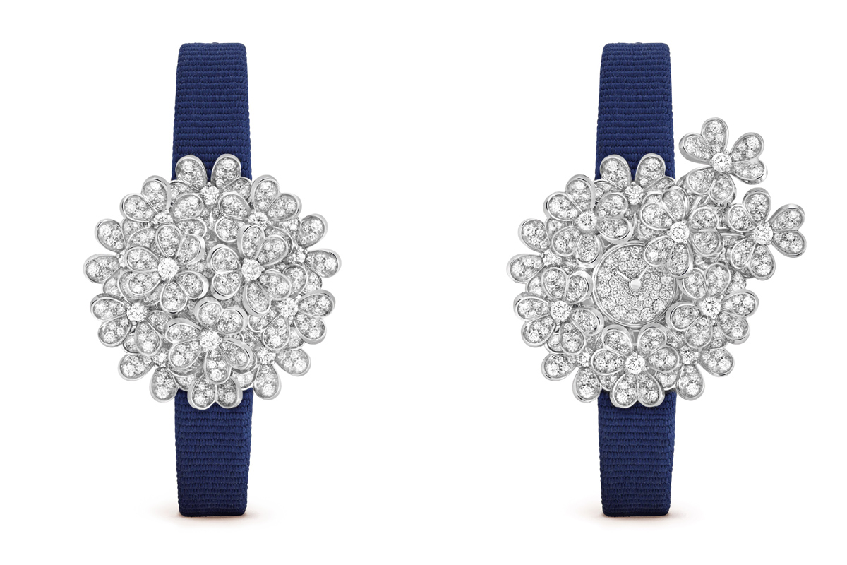 Due modelli infatti si inseriscono nella collezione, in coerenza con quelli che sono i motivi più caratteristici. In altre parole i fiorellini con petali cuoriformi, simili alle cosmee, e i delicati pavé di diamanti al centro dei fiori più grandi si ritrovano puntuali anche negli orologi. Ma qui la maison li sviluppa trovandone una ragione tecnica e decorativa. Compone cioè l’infiorescenza a bouquet di sposa per decorare una cassa da aprire (e chiudere) per svelare (o celare) il quadrante dell’orologio.