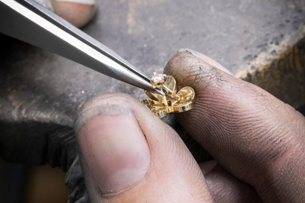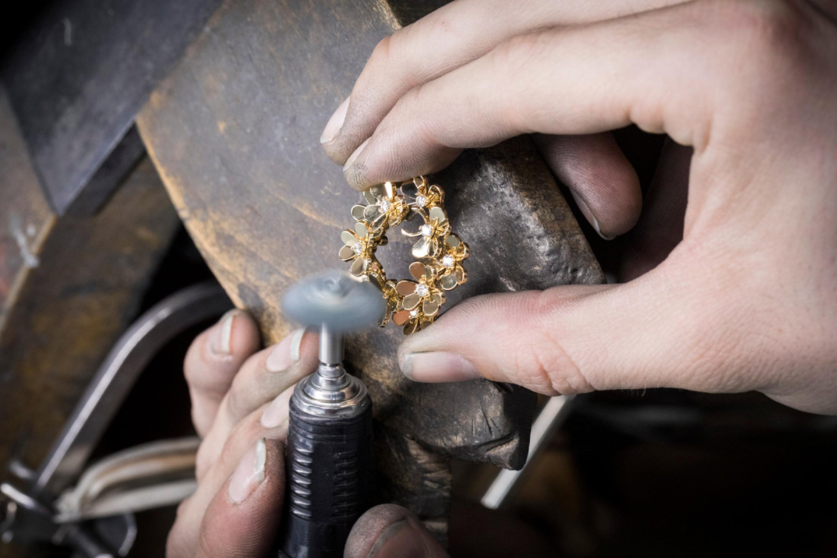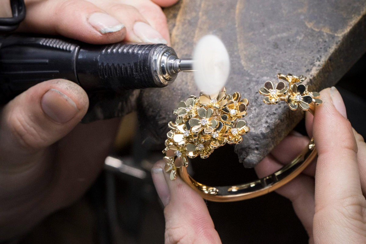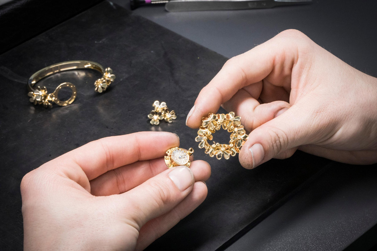Su ogni singolo petalo, infatti, è realizzata a mano la cosiddetta lucidatura a specchio, che conferisce alle superfici una particolare lucentezza; mentre i diamanti sono inseriti con pazienza e attenzione da amanuensi nei forellini à jour creati nel metallo da una specie di ricamo dell’artigiano orafo. All’attenzione meticolosa per il dettaglio si unisce infine la scelta di pietre della massima qualità. Soprttutto diamanti (solo D ed F per il colore, e da IF a VVS per la lucentezza), presenti ovunque – anche negli orologi; e zaffiri rosa per gli altri gioielli Frivole nella stessa tonalità dell’oro.