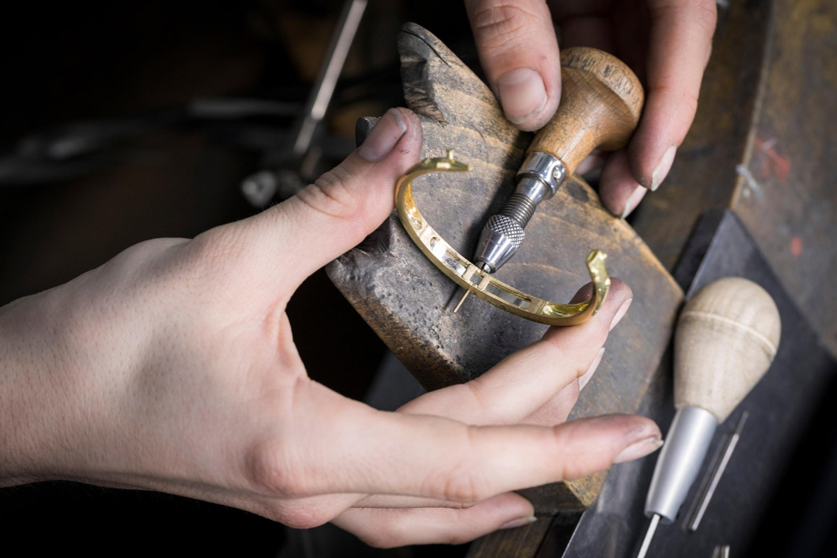 Meno sofisticato, ma ugualmente prezioso, è invece l’altro modello in oro giallo. In sintesi, un sottile bracciale rigido su cui sbocciano i fiorellini con il cuore in pavé di diamanti. Anche in questo caso l’elemento a rotazione che apre e chiude la cassa, a nascondere il quadrante, è un segreto floreale. E anche in questo caso, come in tutta la collezione Frivole, la brillantezza e la luce irradiate sono frutto di un meticoloso lavoro manuale di lucidatura del metallo e di incastonatura delle gemme.