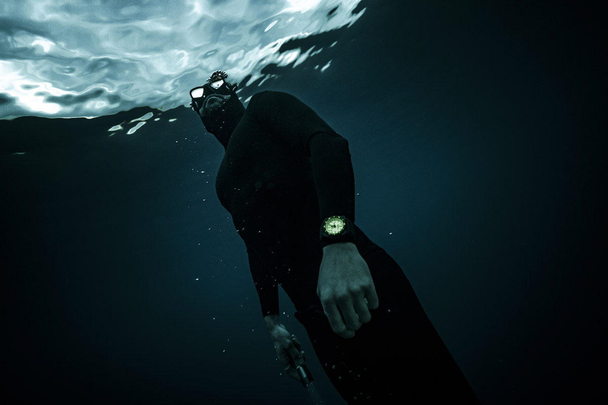 È quando il buio incombe infatti che il Diver Full Lum si prende la scena: perché si “accende” come un faro, grazie al trattamento in SuperLuminova® esteso a tutto il quadrante. Siamo abituati a orologi con dettagli visibili in condizioni di scarsa luminosità, ma l’effetto prodotto dal Diver Full Lum lascia letteralmente a bocca aperta. Due diverse tonalità di verde – una per la base del quadrante (pigmenti C5) e l’altra per lancette, numeri e indici (pigmenti C3) – creano il corretto contrasto per una visibilità perfetta. Con in più la garanzia di un effetto a lunga durata.