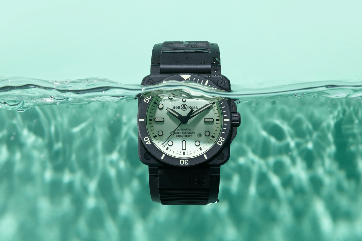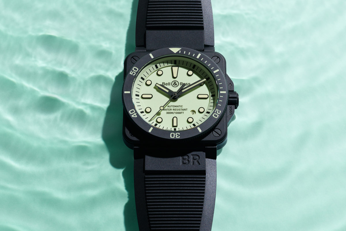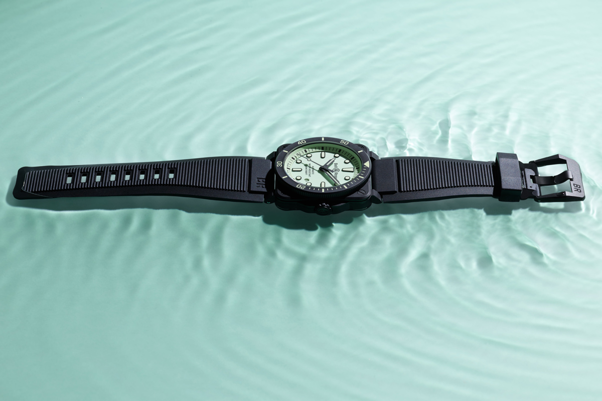 Anche in pieno sole però, il Diver Full Lum si fa ammirare per il carattere fortemente sportivo. Per quell’immagine piena di grinta dell’iconica cassa quadrata, divenuta ormai un classico dell’orologeria subacquea. In questo caso, il materiale scelto da Bell & Ross è la ceramica, le cui doti di resistenza sono arci-note; e si sposano perfettamente con uno strumento che trova il proprio habitat naturale ben al di sotto della superficie del mare. Come rivela l’impermeabilità, che raggiunge le 30 atmosfere.