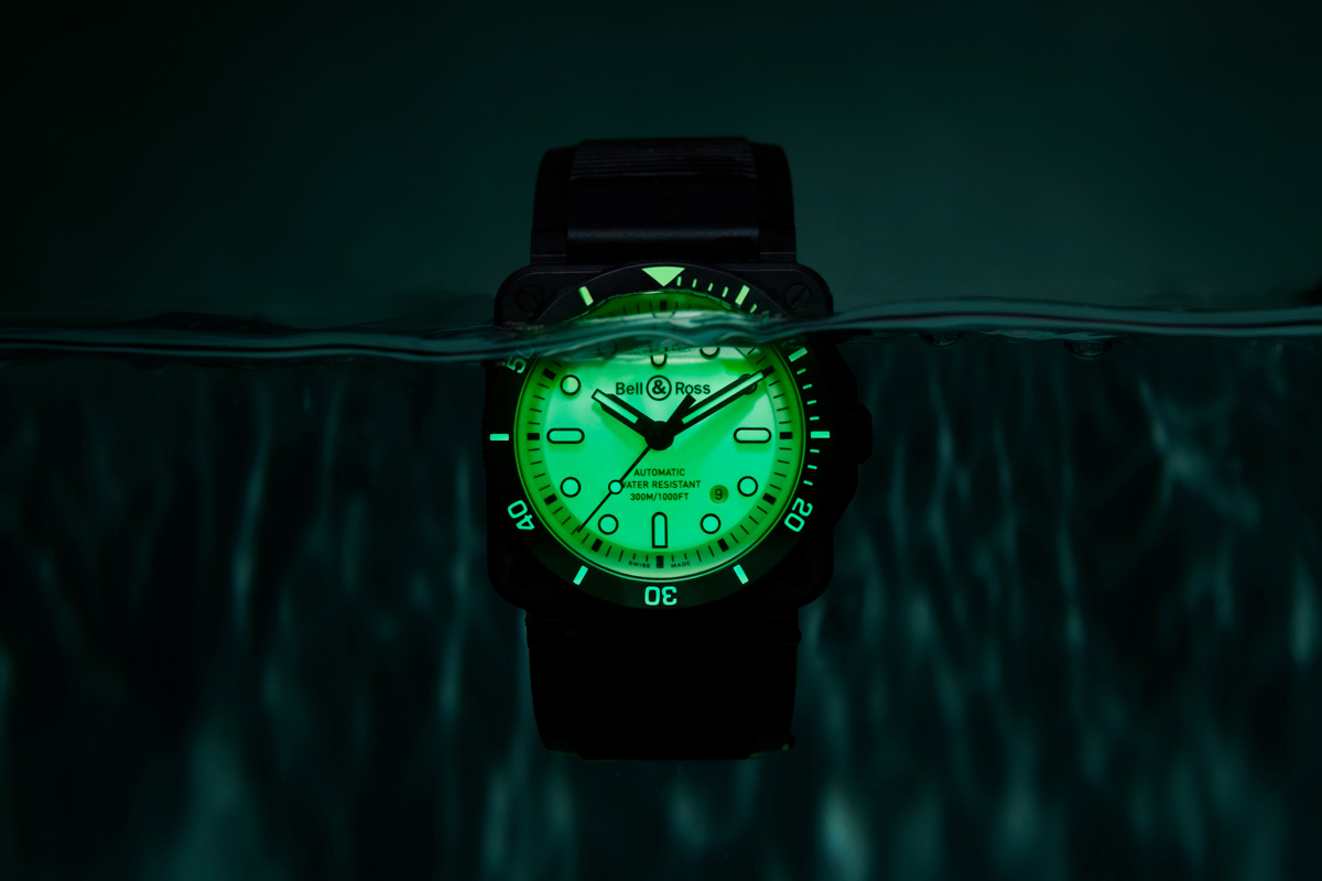 Gli orologi subacquei sono certamente accomunati dalla robustezza, dall’affidabilità e dalla scelta di materiali per i quali la convivenza con l’acqua di mare non costituisce un problema. Ciò che però è fondamentale è la leggibilità. Le informazioni sul tempo di immersione sono vitali e devono essere assolutamente visibili anche al buio delle profondità. Il nuovo Diver Full Lum è, da questo punto di vista, un vero fuoriclasse. L’ultimo nato della collezione BR03-92 si presenta con un look che, visto alla luce, mostra solo una minima parte della “dirompente” personalità.