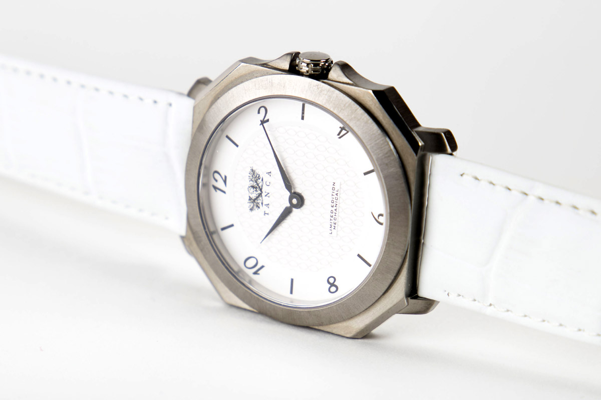 Vediamo quindi l’habillage. La cassa, di forma ottagonale, è leggera e resistente alle abrasioni perché è realizzata in titanio satinato, naturale oppure annerito. Il quadrante è in ceramica bianca o nera; in controluce se ne percepisce la decorazione: il disegno continuo della catena del Dna. «Rappresenta la vita, il trascorrere del tempo e l’io più profondo. In un primo momento», svela Giacomini, «avevamo previsto dei piccoli simboli di infinito in corrispondenza delle ore 3, 6, 9 e 12. Quasi una sfida a rompere il limite del tempo». Invece poi si sono preferiti indici a bastone e numeri arabi, impressi sulla zona più esterna, opaca. Ben calibrata nel design la corona di carica, protetta da due spallette laterali.