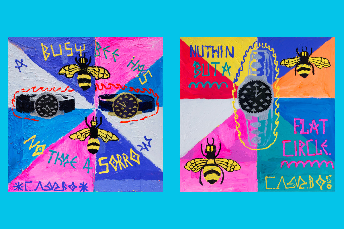 Il progetto G-Timeless infatti ha lanciato a una serie di artisti visivi internazionali una sfida eterodossa al settore orologiero, che è molto concentrato sulle specificità tecniche dei prodotti, ma omogenea allo stile eclettico di Gucci. La sfida era interpretare l’orologio da un punto di vista esclusivamente creativo, mettendo in evidenza in particolare l’elemento che contraddistingue il G-Timeless: il motivo dell’ape. Un motivo utilizzato per la prima volta da Gucci negli anni Settanta come indice delle ore.
