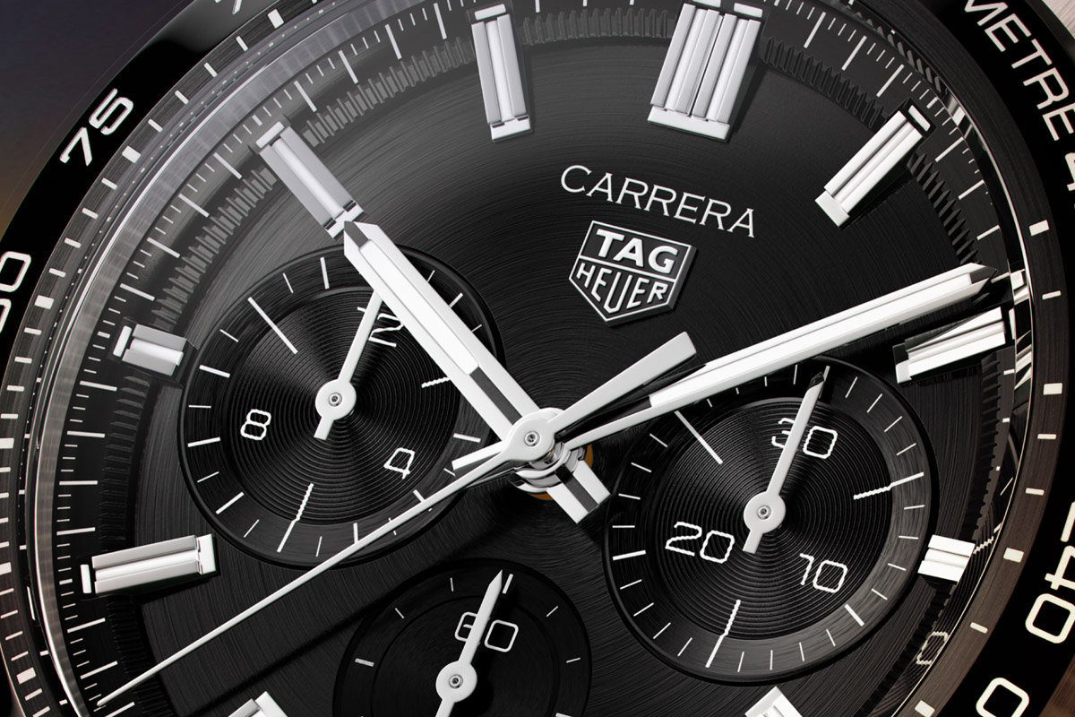 Sul quadrante le lancette di ore e minuti condividono il centro con i secondi cronografici; mentre a ore 3, 6, 9 sono rispettivamente collocati il contatore dei 30 minuti, il sotto-quadrante dei piccoli secondi, che accoglie anche la finestrella rettangolare della data, e il contatore delle 12 ore. Si parlava prima di qualità, di sostanza. Se ci si avvicina ai nuovi Carrera, se con occhio allenato si osservano i dettagli, risulta evidente quanto si è lavorato in tale direzione. Nessun compromesso, quindi: superfici lucide e satinate, in alternanza, giocano con la luce; il réhaut “scende” nel quadrante e, assieme ai contatori incassati, fornisce un piacevole effetto tridimensionale; ancora, la spazzolatura circolare del quadrante “se la intende” con i motivi a cerchi concentrici interni ai contatori.