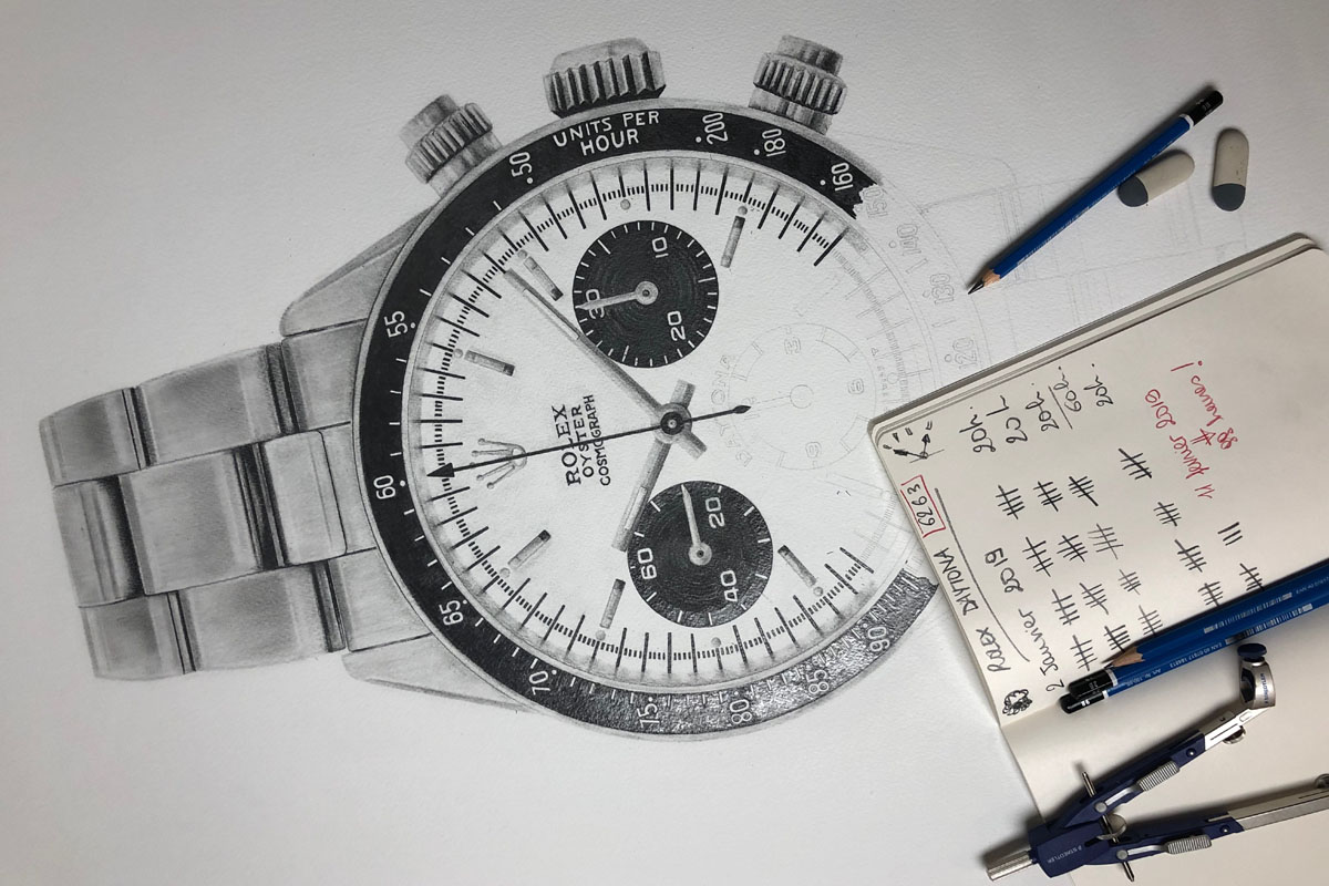 Constance Tournier: Ho iniziato quasi per gioco, tre anni fa, quando il mio fidanzato, appassionato di orologi, mi chiese di illustrare il suo Omega Speedmaster Professional. Nonostante pensassi che non ci sarei mai riuscita, presi un foglio A4 e mi misi all’opera. Da quel momento non ho più smesso di disegnare orologi. In generale, però, trovo affascinante il fatto che degli oggetti piccoli come questi possano custodire così tanti minuti dettagli. Ma è proprio ciò che mi piace: riuscire a illustrare con precisione ogni singolo componente. È un’attitudine che ho da sempre, cogliere i dettagli in tutte le cose. Trovo infatti difficile realizzare disegni non realistici. Ricordo che il mio insegnante d’arte a scuola mi diceva sempre di sognare di più, di lasciarmi andare alla fantasia.