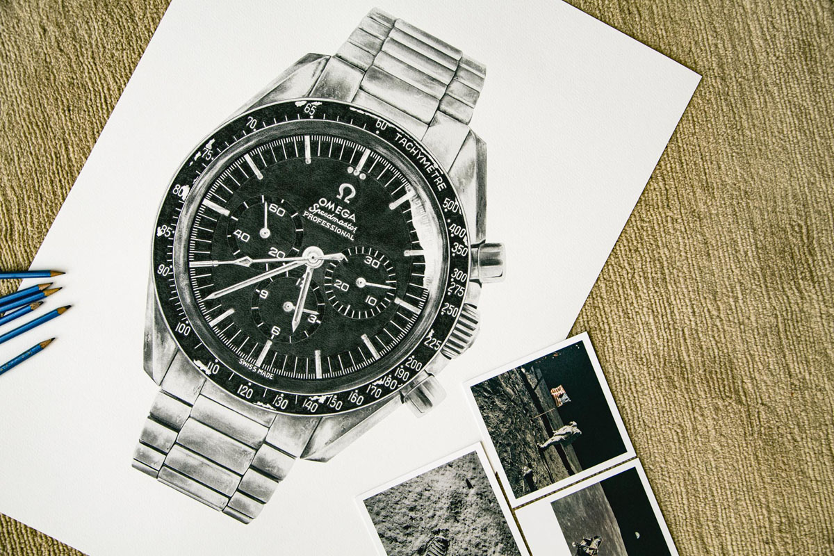 Constance Tournier: Prima di iniziare un nuovo disegno, cerco di capire qual è l’orologio che il pubblico ama di più. Inoltre, in occasione di eventi speciali, mi piace disegnare i modelli che hanno accompagnato la storia. Come, per esempio, lo Speedmaster 105.012: è stato il primo orologio ad andare sulla Luna. L’ho disegnato lo scorso anno, in occasione del 50esimo anniversario del primo allunaggio.