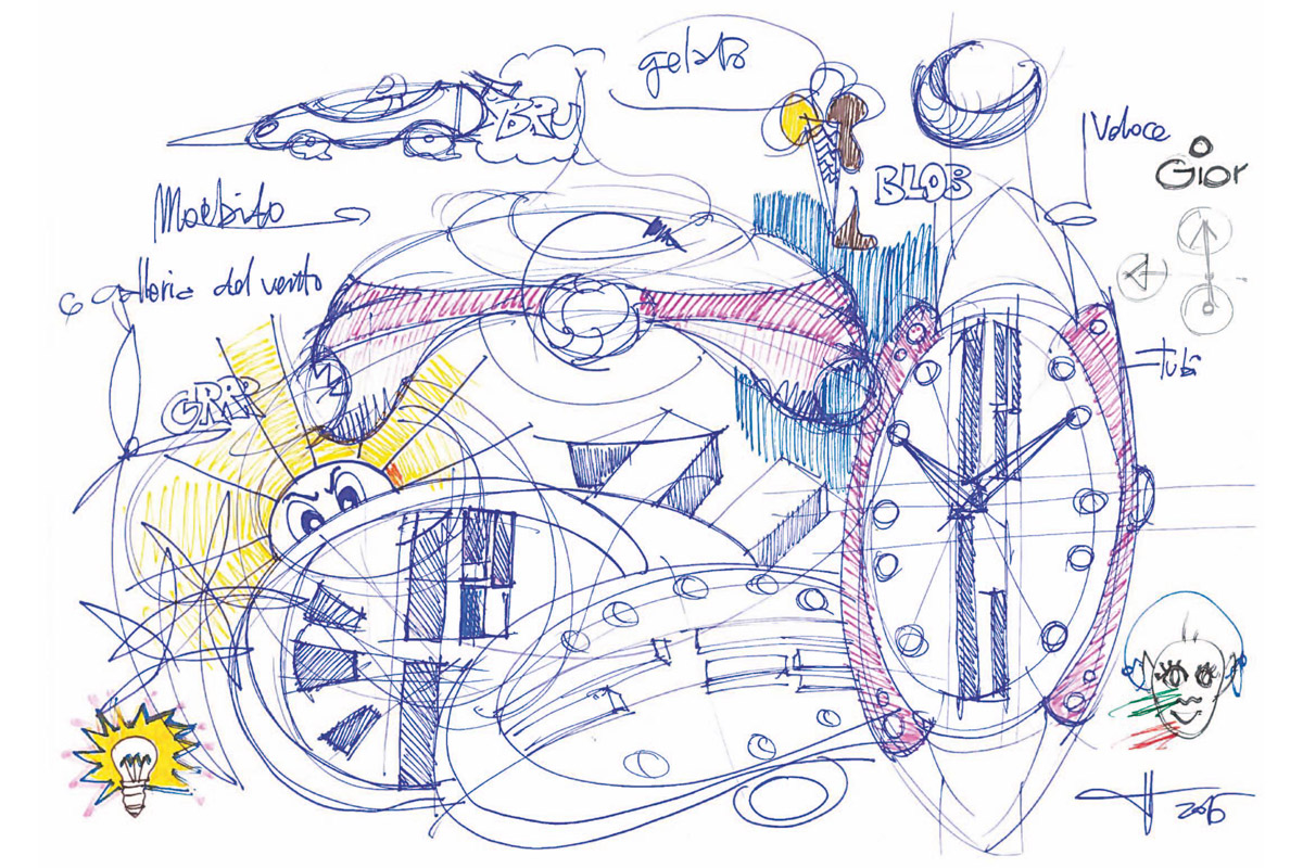«Quando progetto un orologio non penso mai a un orologio. Seguo l’istinto che nasce da un particolare che mi ha colpito… Poi sviluppo e modifico a seconda delle esigenze tecniche», spiega Giorgio Grimoldi. «La visione cubista e futurista che ho, mi permette di decostruire e riassemblare, in modo ordinatamente disordinato, i particolari tecnici». Orologio e macchina si fondono. Un grande arco raccorda il lunotto posteriore dell’auto alla fanaliera anteriore, formando la cupola del vetro, come se fosse una leggera bolla di sapone. Il “bocchettone” anteriore per la presa dell’aria della macchina diventa la sede del cinturino. I “siluri” delle fiancate della macchina la carrure dell’orologio. Lo specchietto retrovisore il fondello. Il guscio esterno ha preso forma, morbido come una scultura di Henry Moore uscita dalla galleria del vento di Maranello.